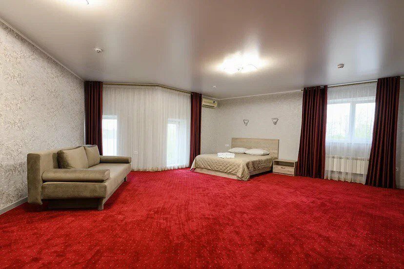 Большой номер, в котором есть не только удобная двуспальная кровать, но и большой мягкий диван, на котором могут расположиться два человека. Номер со всеми удобствами. Есть телевизор и кондиционер.Доп. место - 500 рублей.