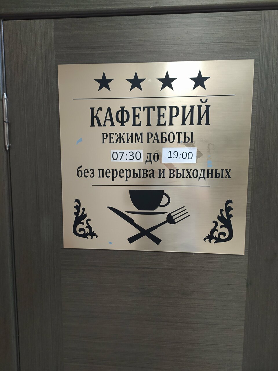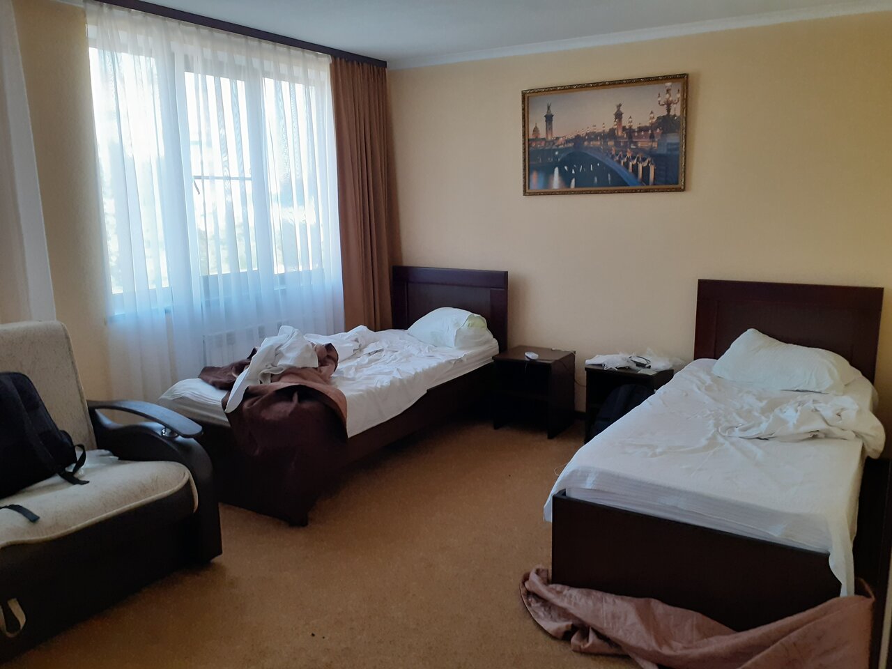 Жил в номере на 3 этаже. Номер усталый. Ковролин со следами сигарет, мебель очень простая. В номере запах старого помещения и сероводорода. Сначала думал что-то с канализацией, но потом все выяснилось — вода с таким запахом течет из крана. У того, кто принял душ не снимая с серебряных украшений, эти украшения стали золотыми (на внешний вид). Ужина в гостинице не было, а вокруг гостиницы точек общепита тоже не особо…