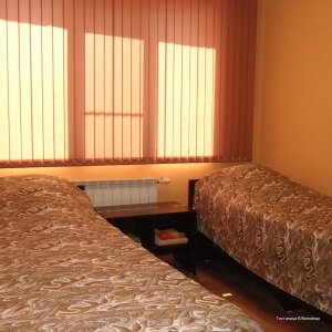 уютный небольшой номер с двумя кроватями, холодильником, телевизором, санузлом и прихожей. В номере имеются прикроватные тумбы.