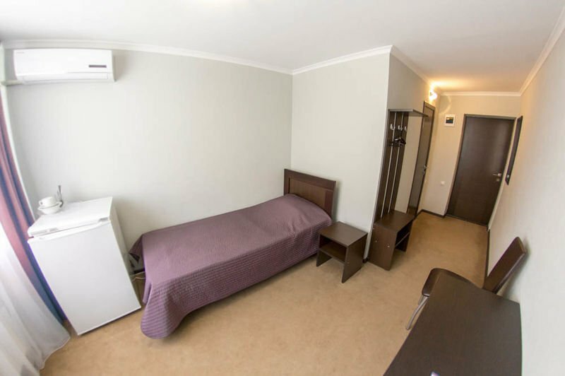 уютный небольшой номер с одной кроватью, холодильником, телевизором, санузлом и прихожей. В номере имеется письменный стол и прикроватная тумба.