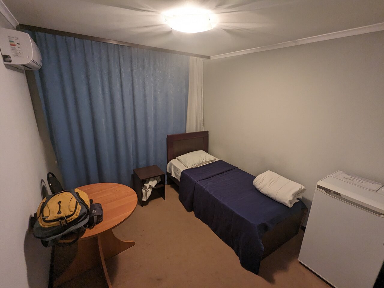 Номер более менее,средний по площади,паласы вытертые почти до дыр,потолки застряли в 90-х(побелка).Есть и положительные моменты: кондиционер,стол(обеденный или для завтрака Вам решать),холодильник.Воды в номере нет,есть кулер на этаже,посуды нет(можно взять у администратора),свет в номере никакой.На мой взгляд отель заслуживает оценку 4,потому что видел намного хуже.