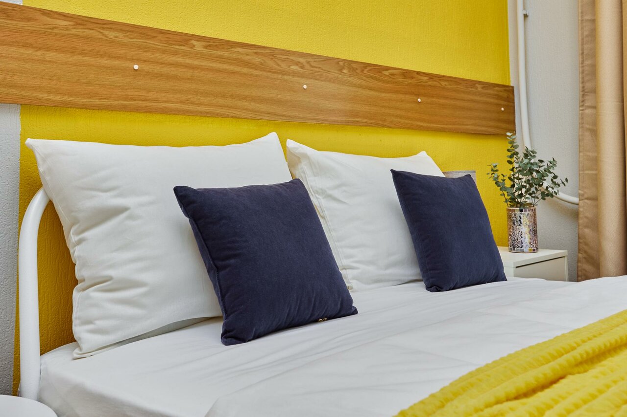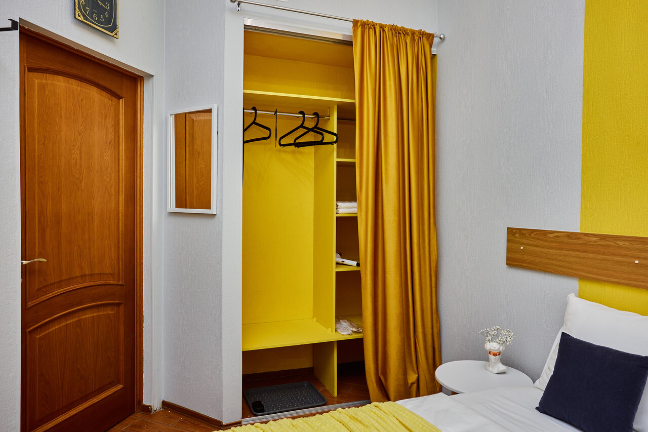 Светлый двухместный номер категории эконом порадует гостей ортопедическим матрасом, шторами блэкаут и натуральным хлопковым постельным бельем. В номере есть места для хранения вещей, фен.