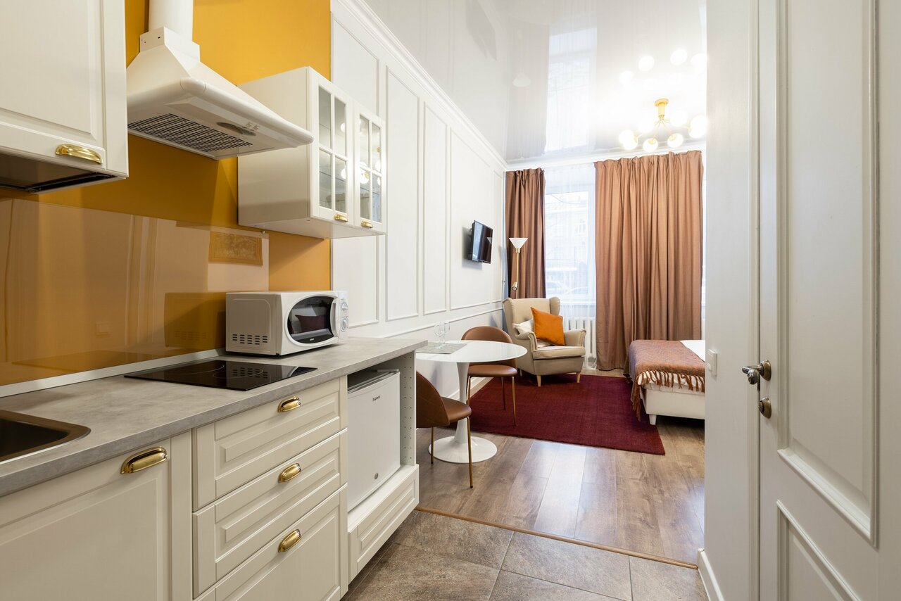 Жила на Певческом переулке 5, квартира уютная, все под рукой. Всё чисто и красиво. В квартире есть микроволновка, чайник и холодильник. Рекомендую. На все вопросы отвечают оперативно.