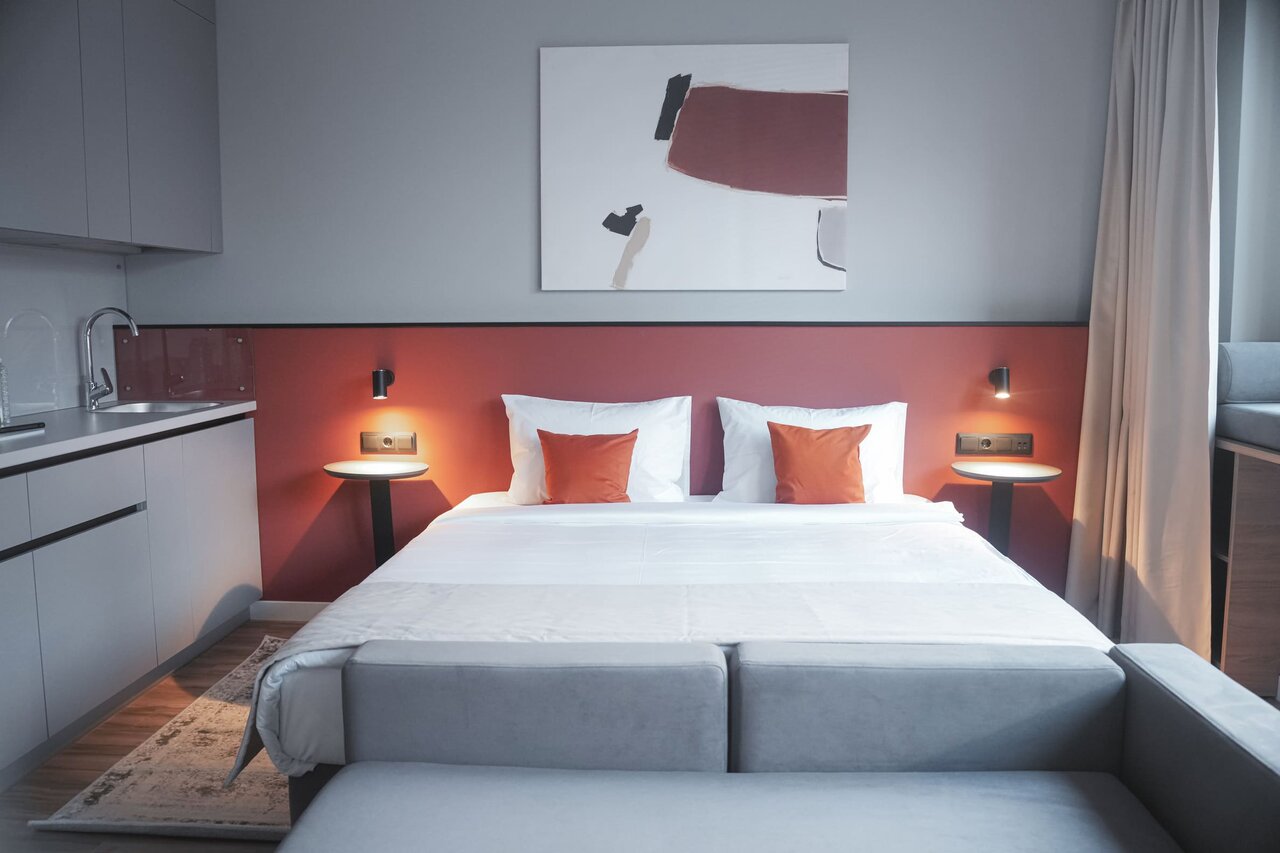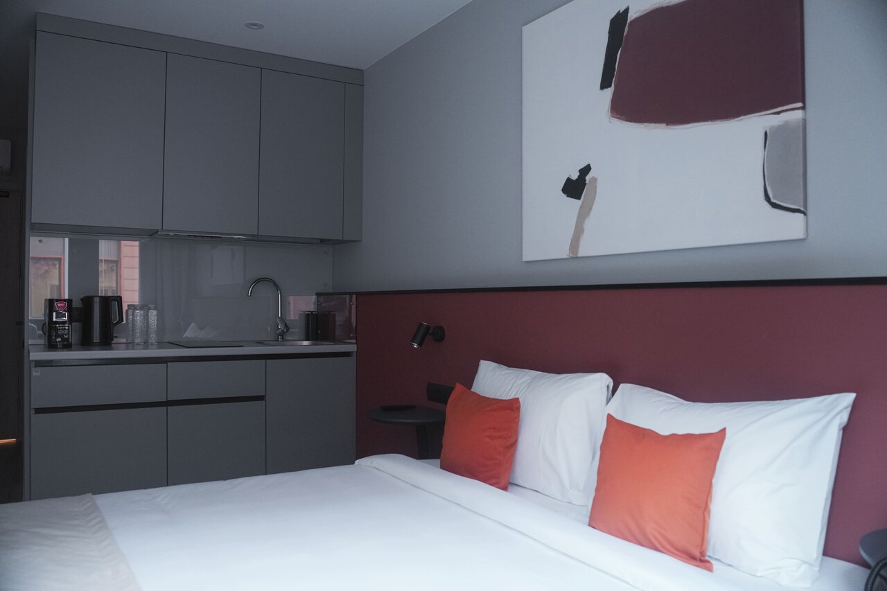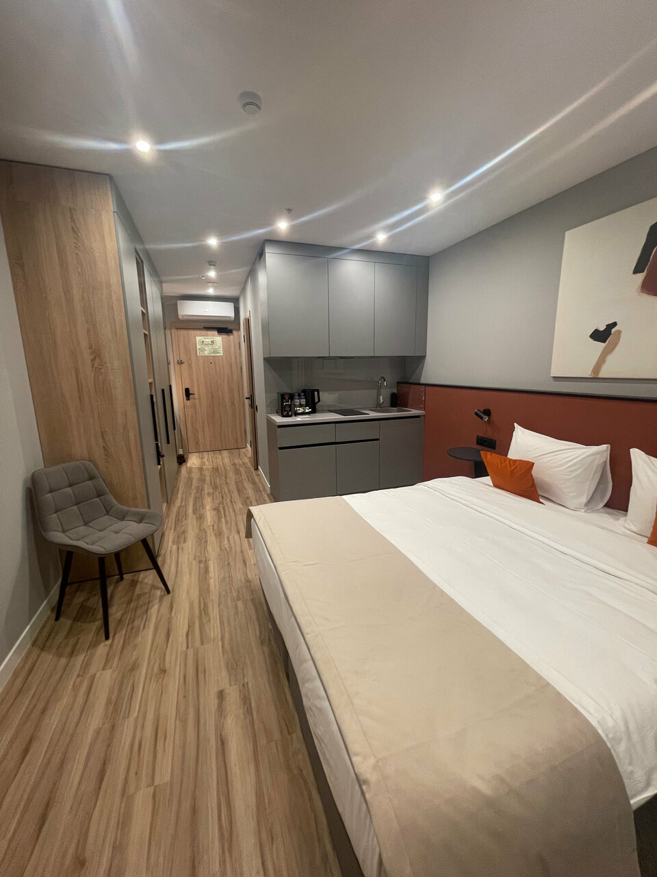 Проживала в отеле спустя 2 дня после его открытия. Все новое, чистое, матрас-постельное-полотенца-халаты очень хорошего качества! В номере полноценная кухня, посуда на 2х, капсульная кофемашина. Зональный свет, розетки у кровати. На подоконнике матрасик и подушка для посиделок на окне