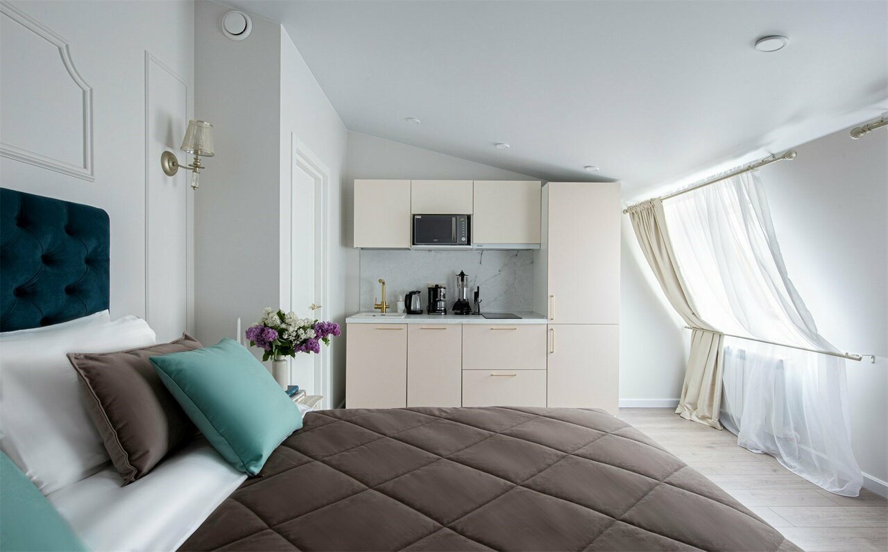 Однокомнатный номер-студия с собственной полноценной кухней и ванной комнатой.