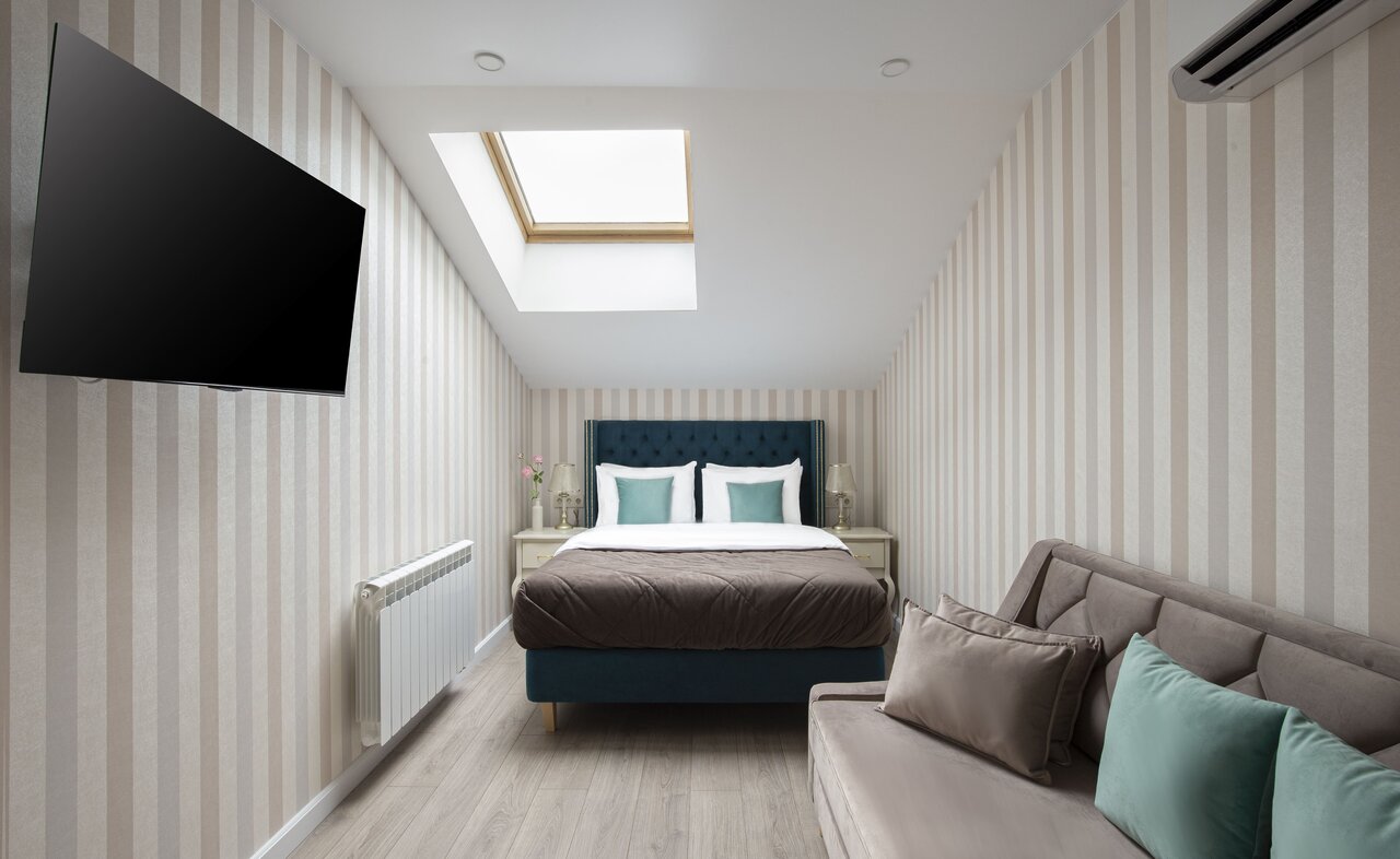Двухкомнатный люкс, который включает в себя: изолированную спальню с кроватью размера king size, кухню-гостиную и просторную ванную комнату.