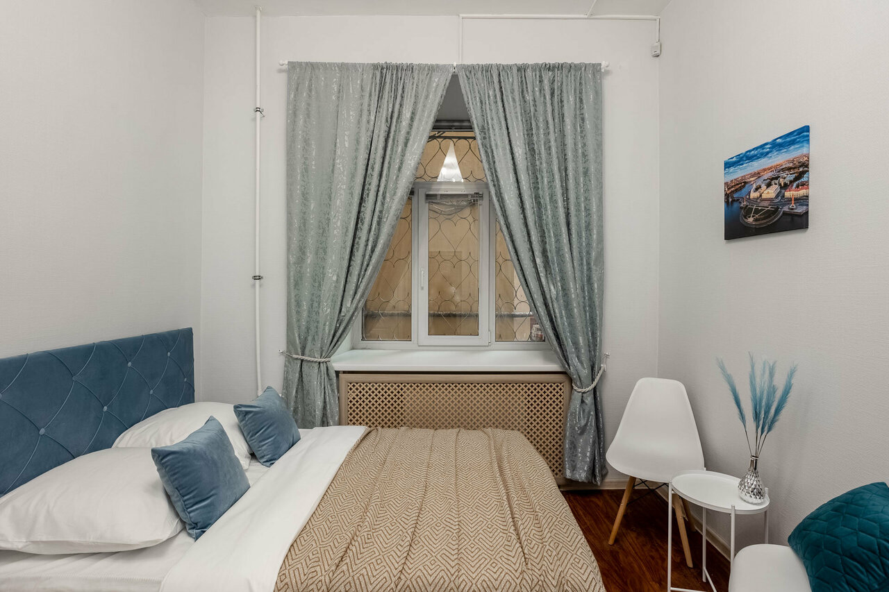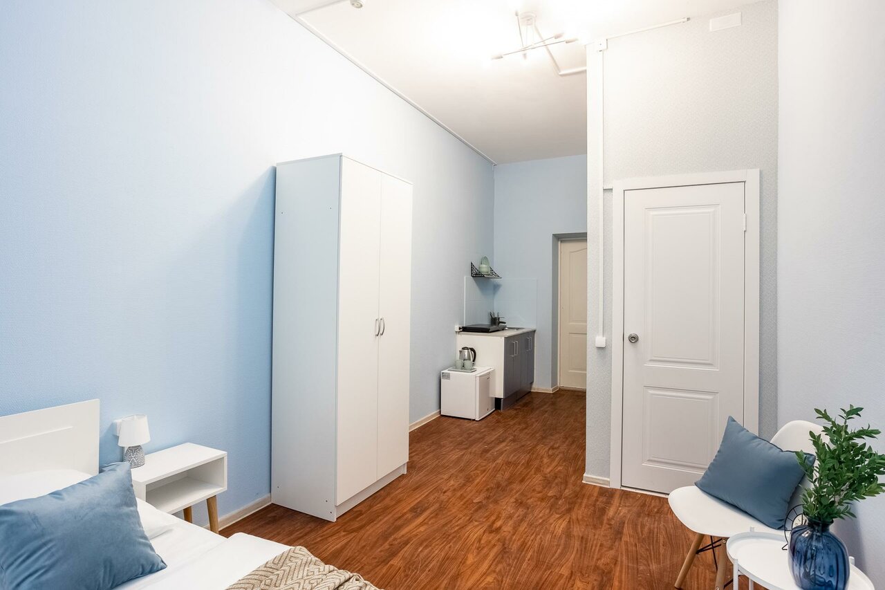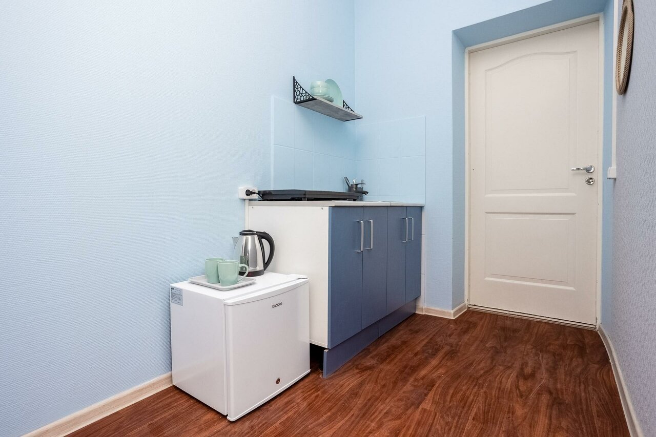 В номере очень рационально и эффективно использовано пространство: имеются электроплита для готовки, шкафчики и полочки с посудой, раздельные душевая и туалетная комнаты, холодильник, шкаф и даже сушка для одежды. Можно почувствовать себя жителем Питера — номер расположен в дореволюционном жилом доме. Выходишь — сразу в типичном дворике. С другой стороны — тенистый бульвар с высокими деревьями. Многие исторические объекты в шаговой доступности, рядом метро, остановки троллейбусов и трамваев.