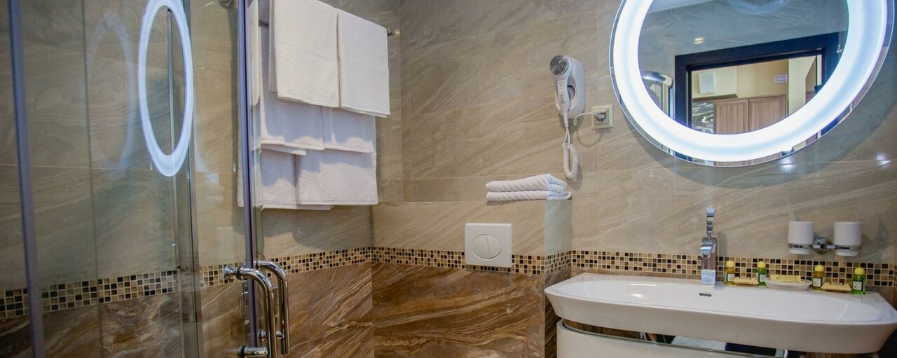Грязновато, вода пахнет железом, батарей нет, тапочки покупать надо на ресепшене.