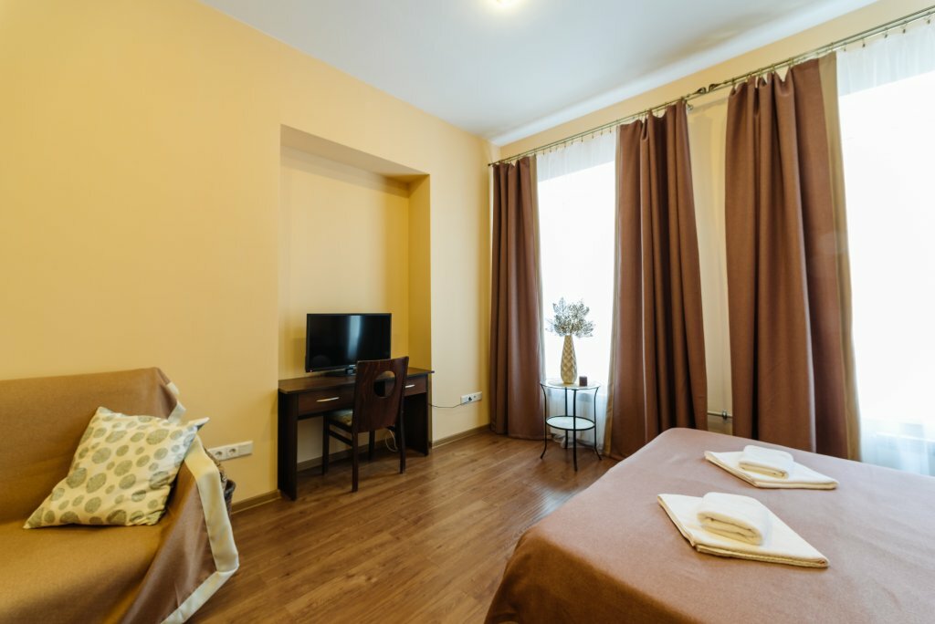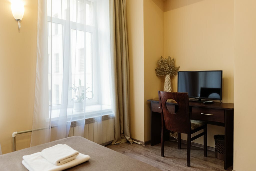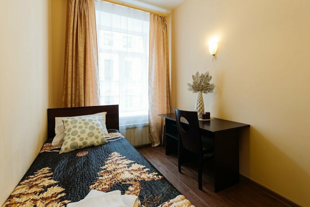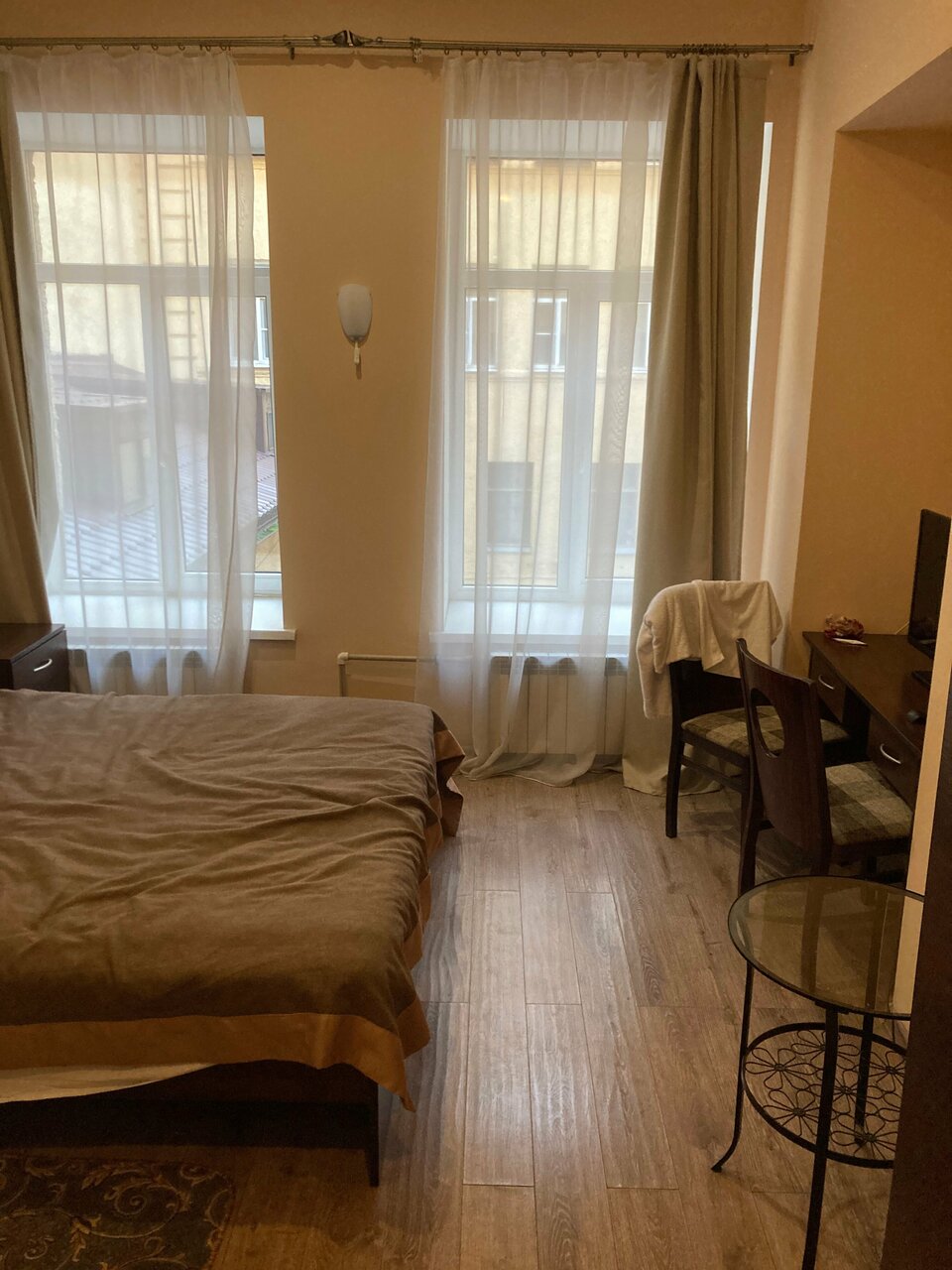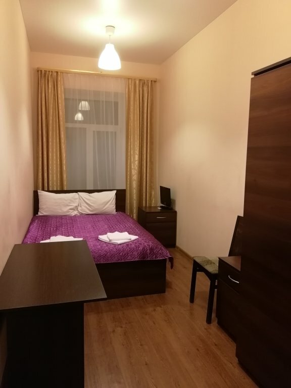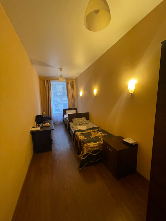 Хуже не бывает. Не отель, а хостел. Комната узкая, неудобная. Лампа далеко от кровати, надо вставать. Мебель старая, обгрызенная, матрасы продавленные и из них выпирают пружины, скрипят при малейшем движении. Полотенца старые, грубые, плохо выстиранные, серые, с пятнами. Санузел далеко, ночью встать и найти проблема. Посуда старая, облупленная, из неё есть противно, перешли на одноразовую. Когда вернулись в Москву, то при распаковке вещей обнаружилось, что привезли с собой таракана!… Никому не советую здесь селиться, даже несмотря на отличное расположение у Медного всадника.