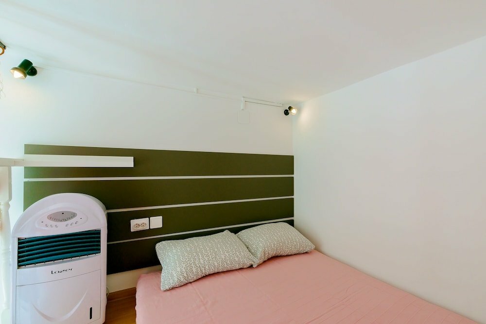 Уютный двухместный номер с двуспальной кроватью. Есть телевизор, кондиционер, комод для одежды, вешалка, прикроватный столик.