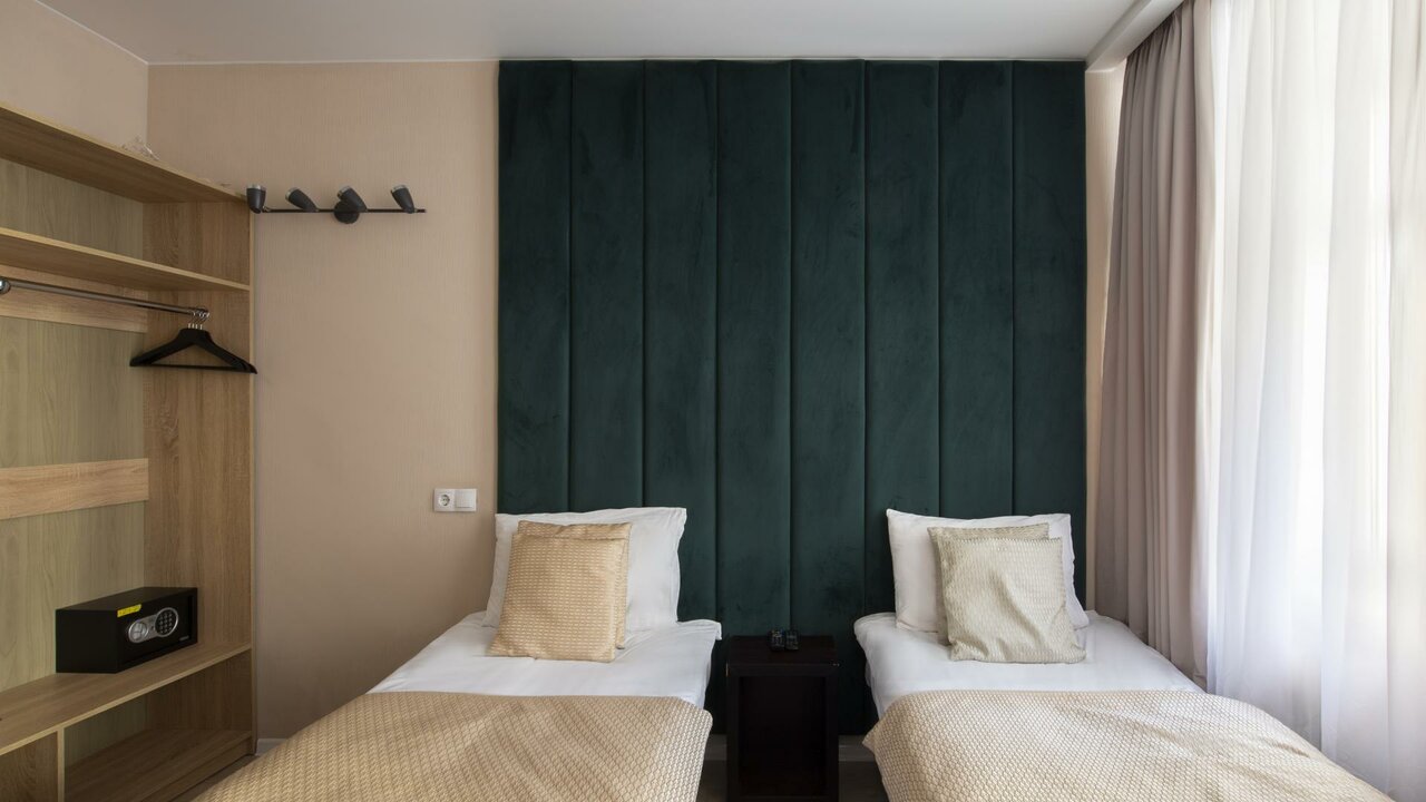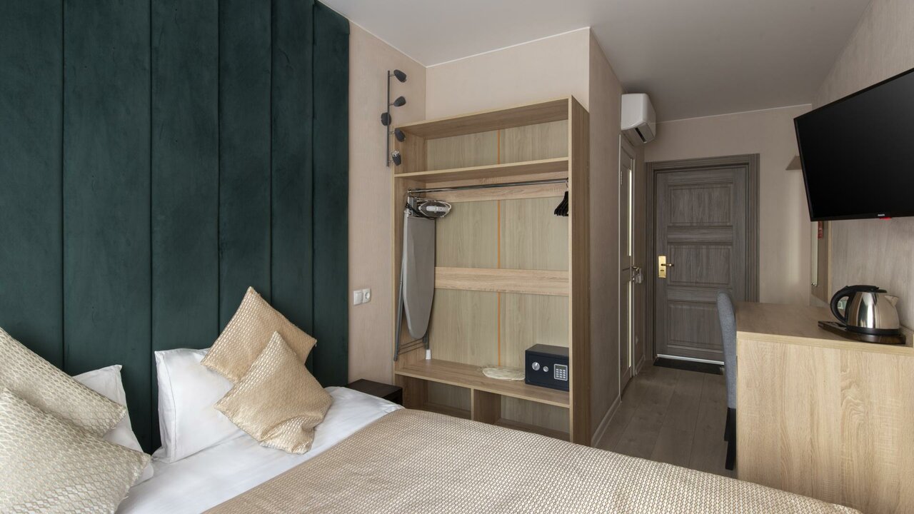 Улучшенный номер в отеле Амиго. В номере есть: кондиционер, двуспальная кровать с ортопедическим матрасом, ТВ, кофеварка, чайная станция, гладильный набор, с/у в номере, шумоизоляция.