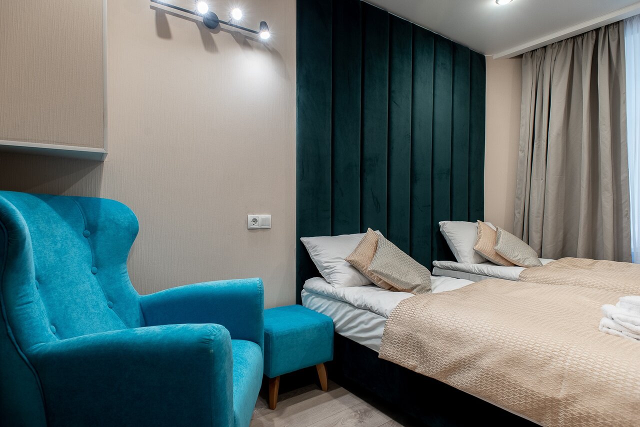 Номер оснащен кроватями с ортопедическими матрасами, кондиционером, чайной и кофейной станциями, гладильным набором, холодильником. С/у в номере.