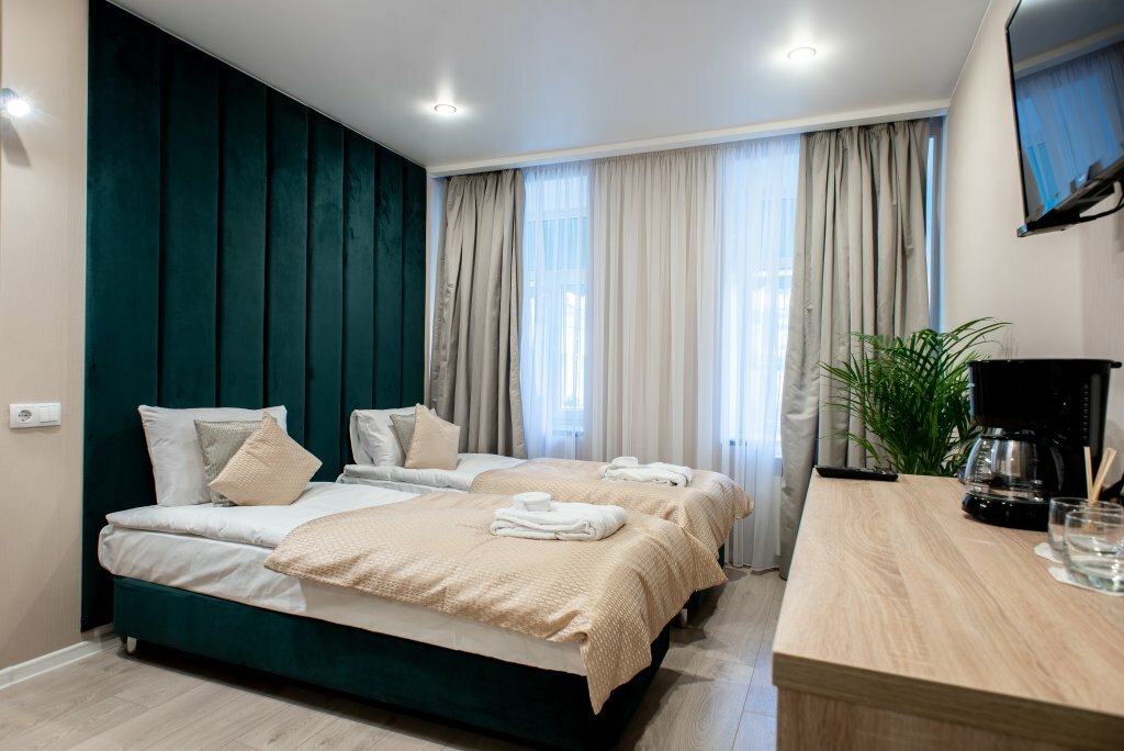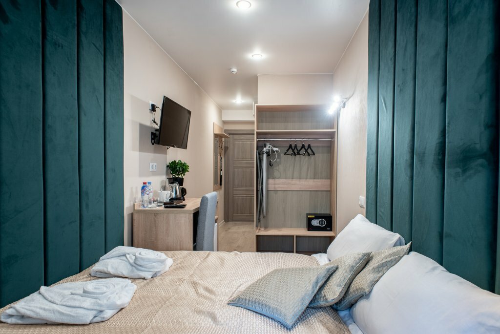 Останавливались на 5 дней в улучшенном номере. Все отлично: номер чистый, постель очень удобная, спалось мега-сладко после намотанных 20 тысяч шагов каждый день))) Все электро и сантехническое оборудование работало исправно, вай-фай быстрый. Расположение: самый-самый-самый центр, закрытая территория. Рекомендую отель и номер в зеленых тонах))) Он благоприятно влияет на настроение и качественный отдых! Если будем останавливаться в центре, то только здесь.