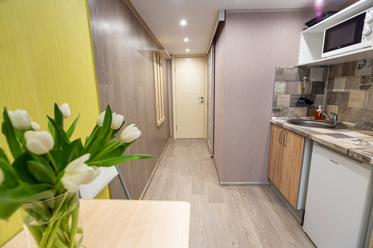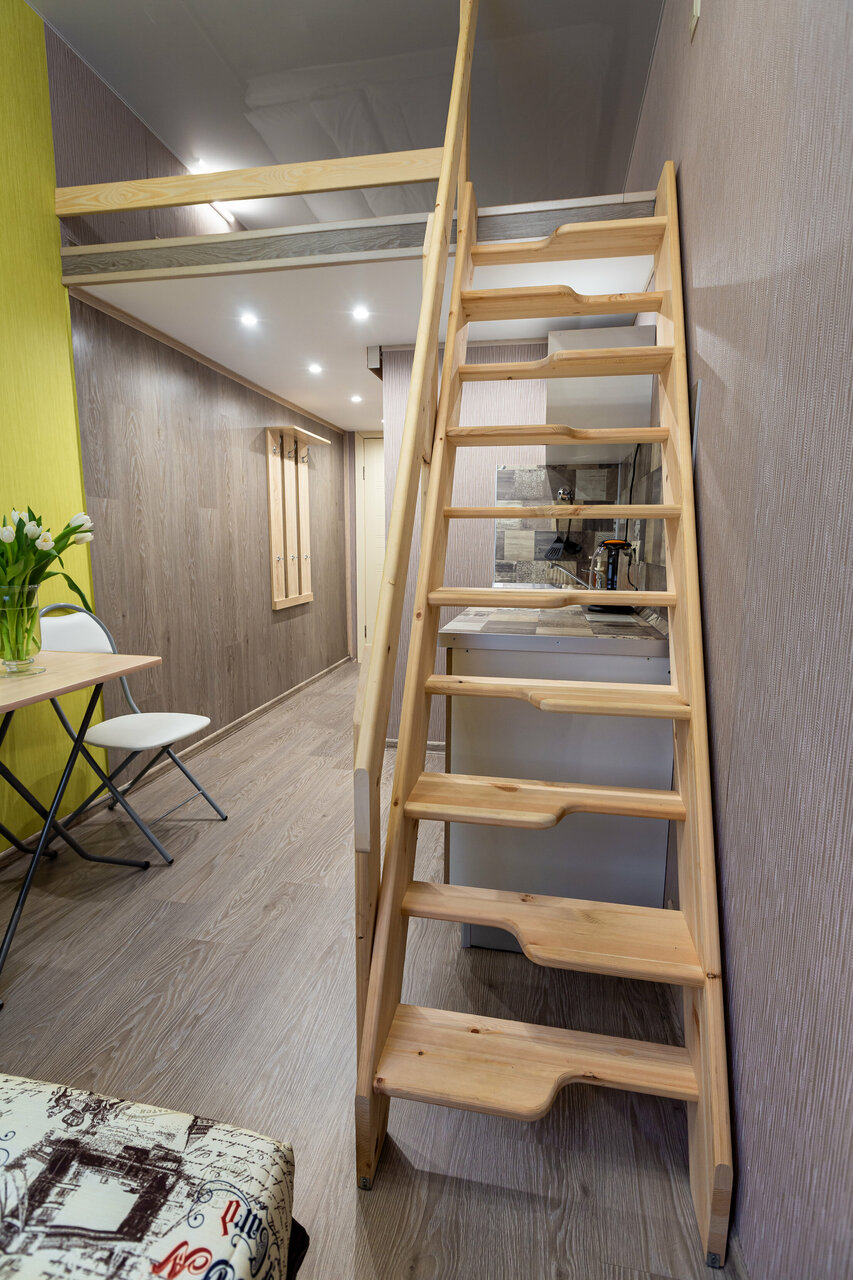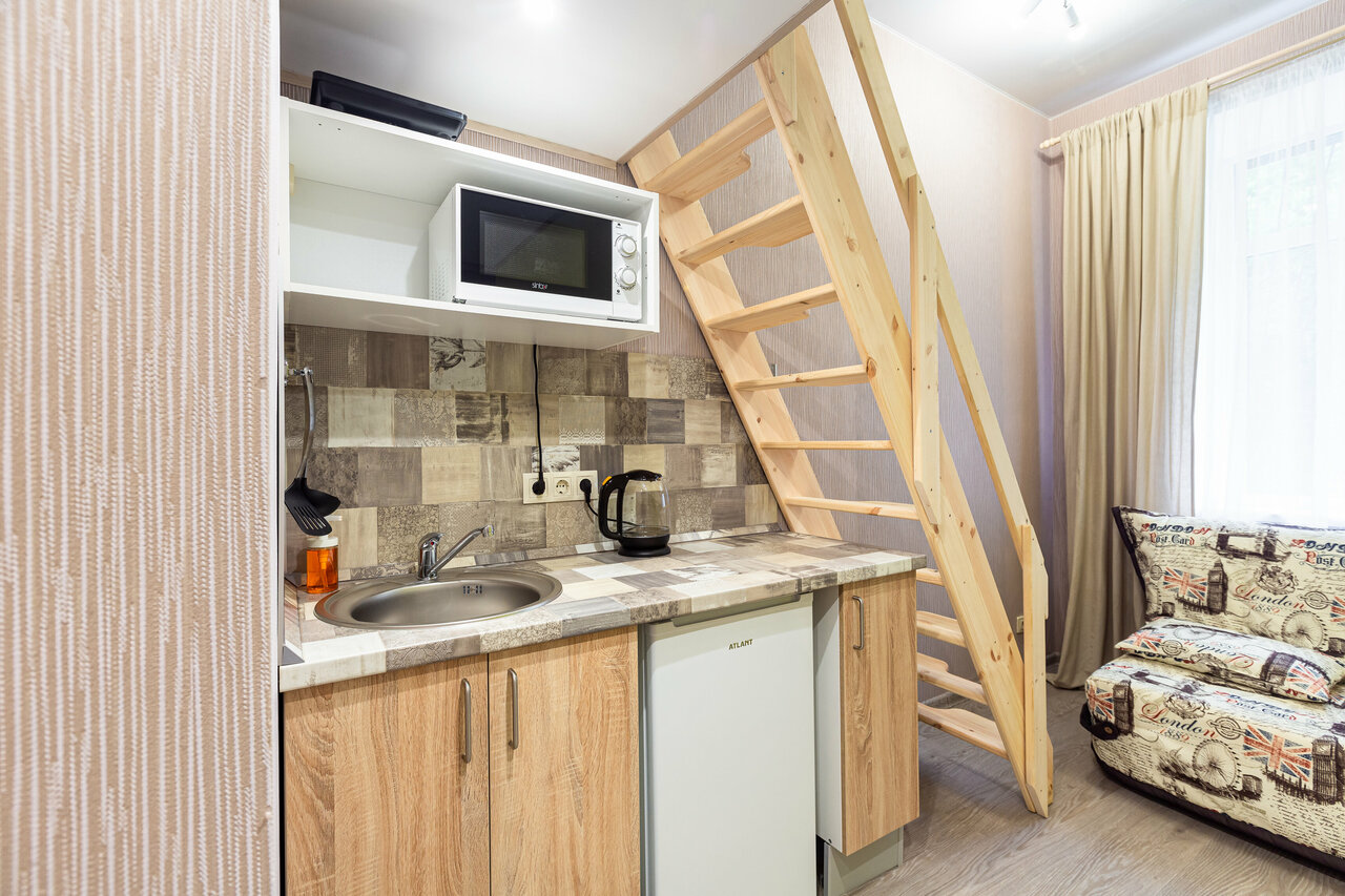 Все очень уютно и комфортно. В аппартаментах есть все необходимое. Удобное расположение. В студии легко вместятся 4 человека. Неординарное решение кровать на втором этаже, очерь понравится, как детям, так и взрослым