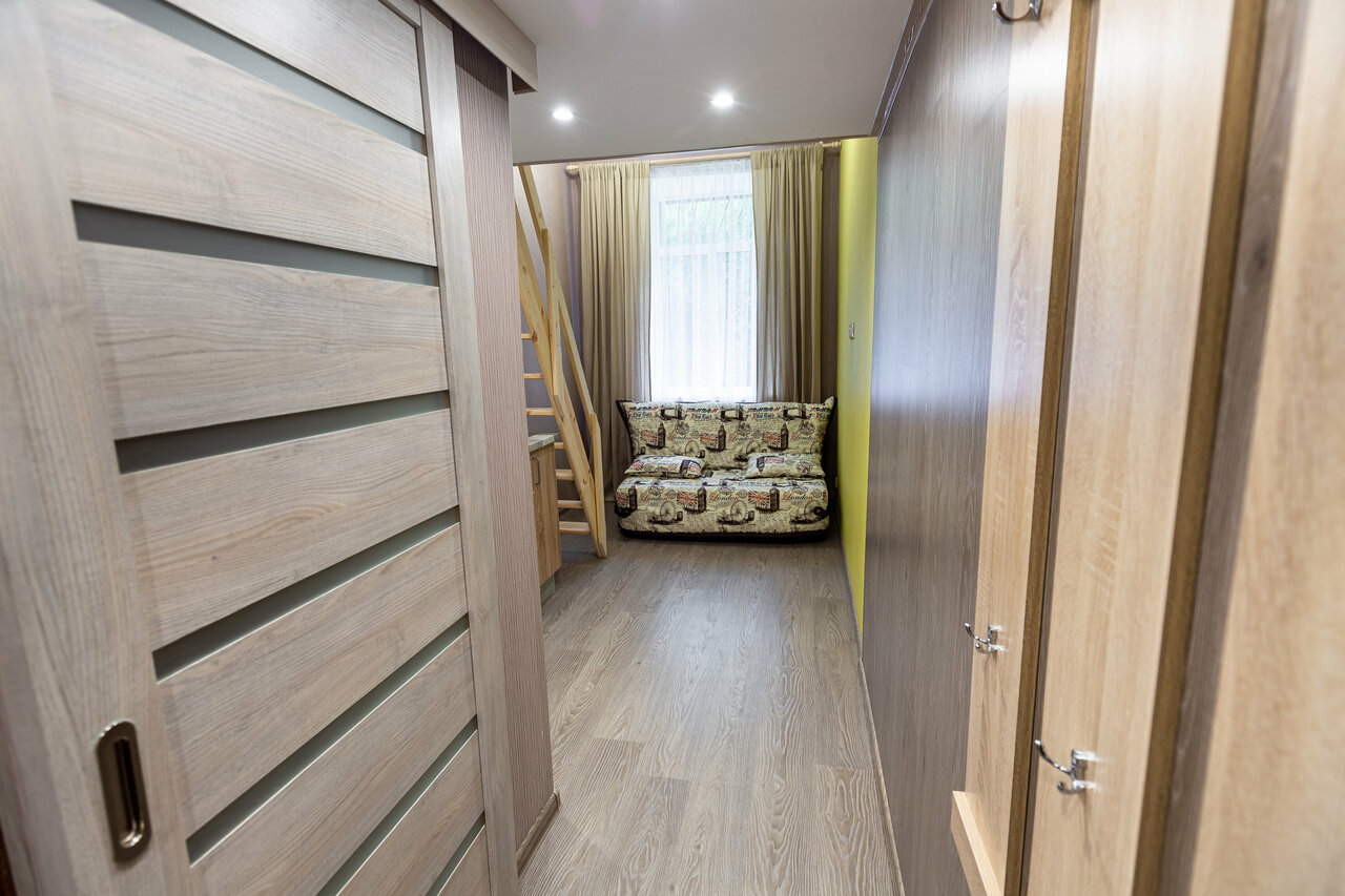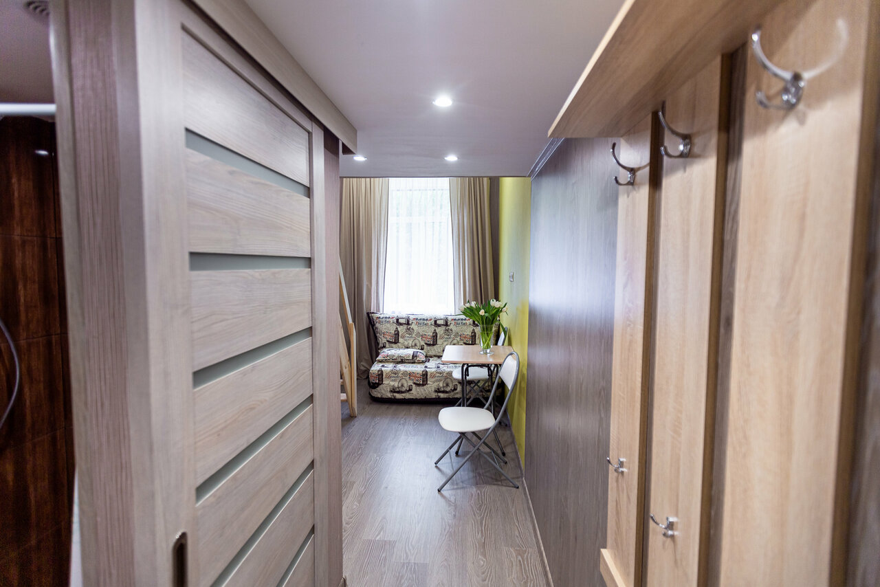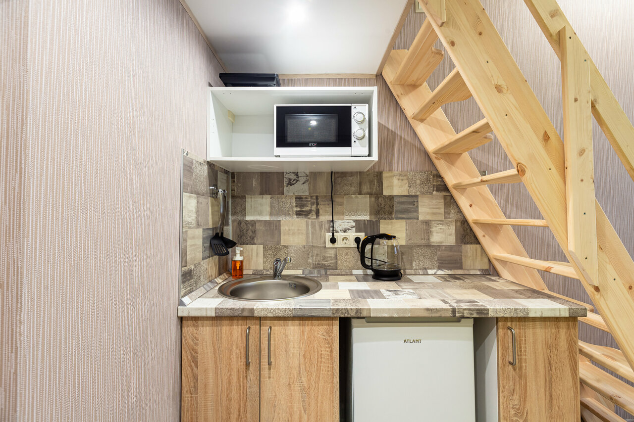 Все очень уютно и комфортно. В аппартаментах есть все необходимое. Удобное расположение. В студии легко вместятся 4 человека. Неординарное решение кровать на втором этаже, очерь понравится, как детям, так и взрослым