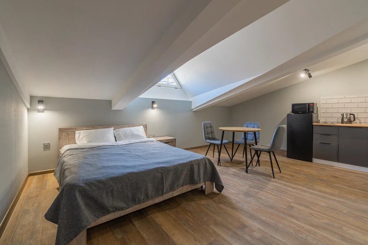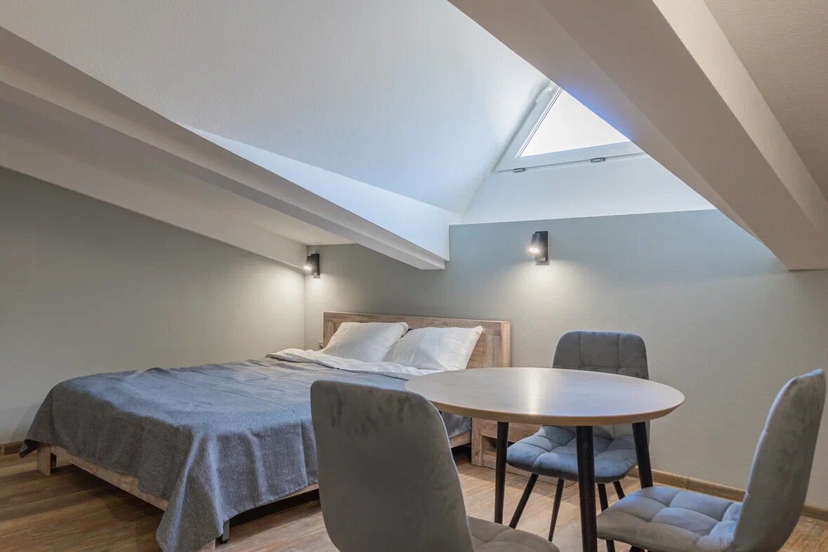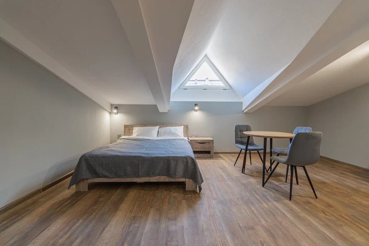 Добро пожаловать в наш номер Комфорт, расположенный на мансардном этаже, где уют и функциональность нашли идеальное воплощение. Площадь номера тщательно продумана, чтобы максимально использовать каждый квадратный метр, создавая комфортную атмосферу.