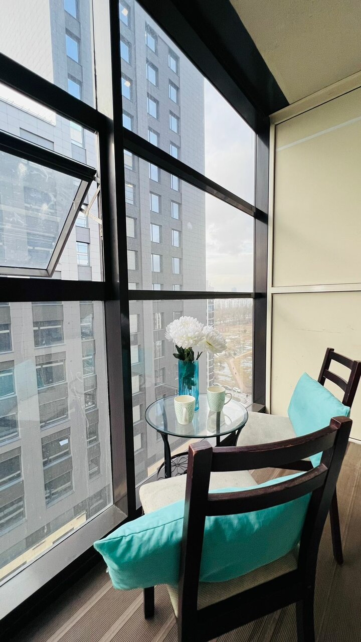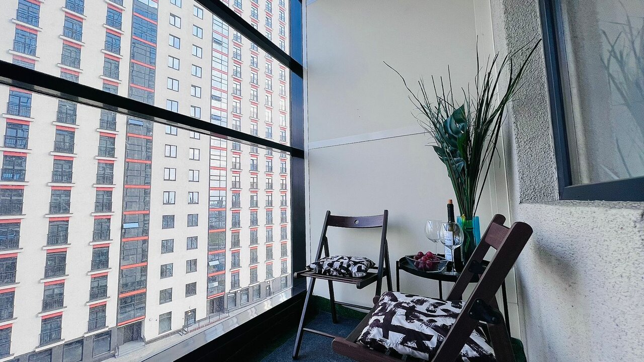 Апартамент с панорамным балконом, обустроенной кухней и ванной комнатой. Все что нужно для комфортного пребывания.