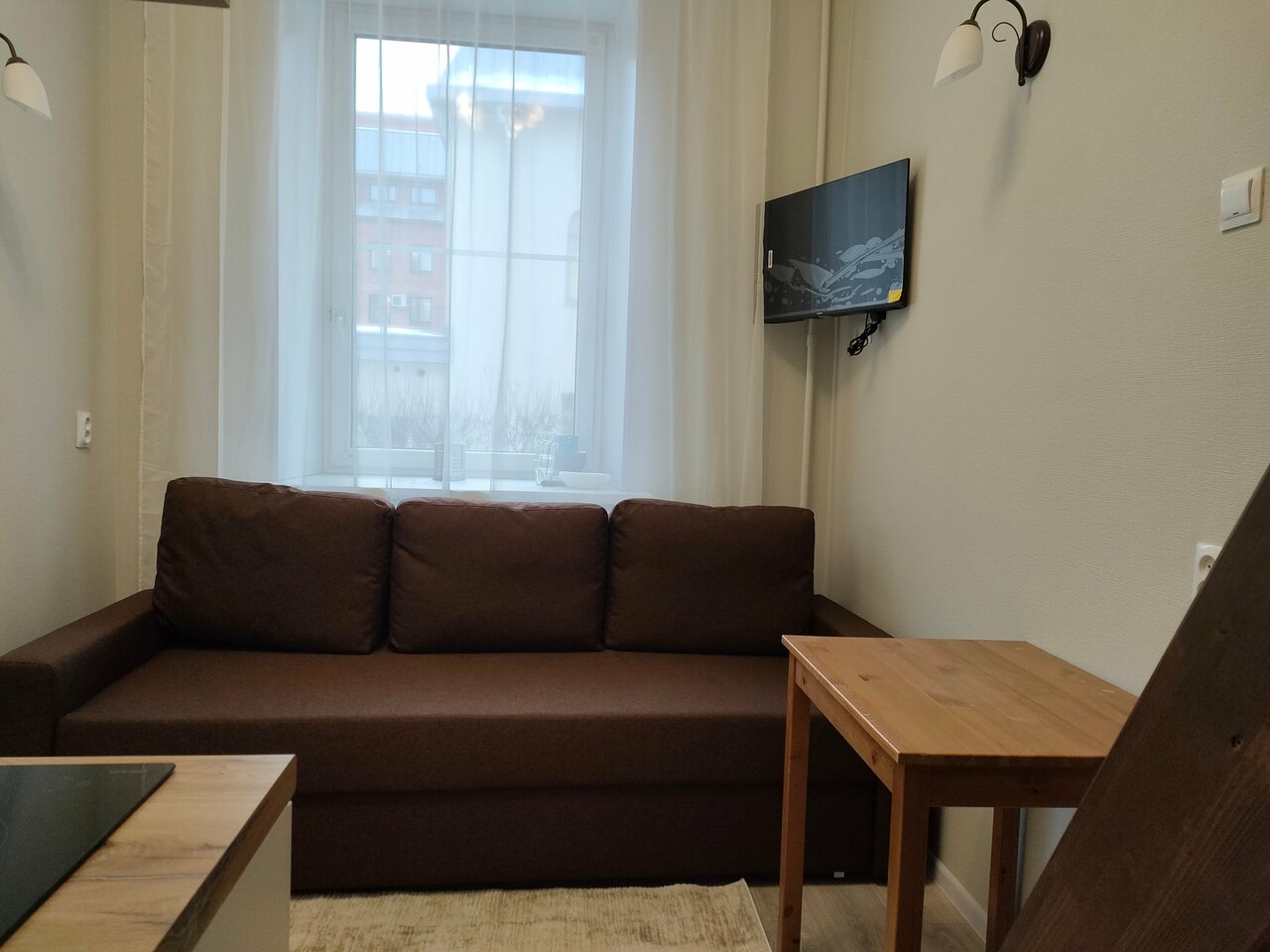 - Удобный формат апартаментов (кровать, диван, мини-кухня).
