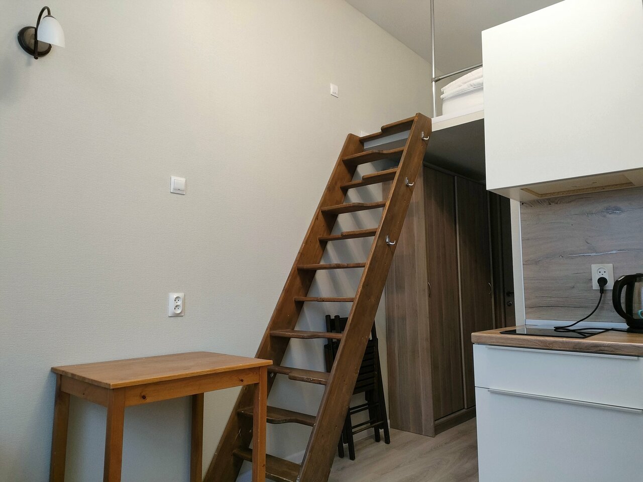 Хороший вариант для туриста. Мини-квартирка с сан-узлом, небольшой кухней и набором посуды для готовки. В коридоре расположены утюг, гладильная доска и стиральная машина. Вай-фай и ТВ в наличии, все работает исправно. Расположение очень порадовало, в пешей доступности находятся станции метро, так же большой торговый центр с магазинами одежды, кафе, продуктовыми магазинами. Мне было удобно добираться до необходимых мне достопримечательностей. Интересная фишка с кроватью на втором этаже)