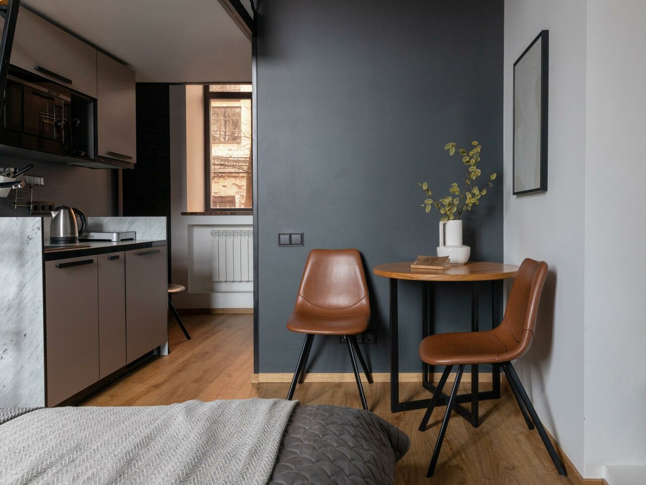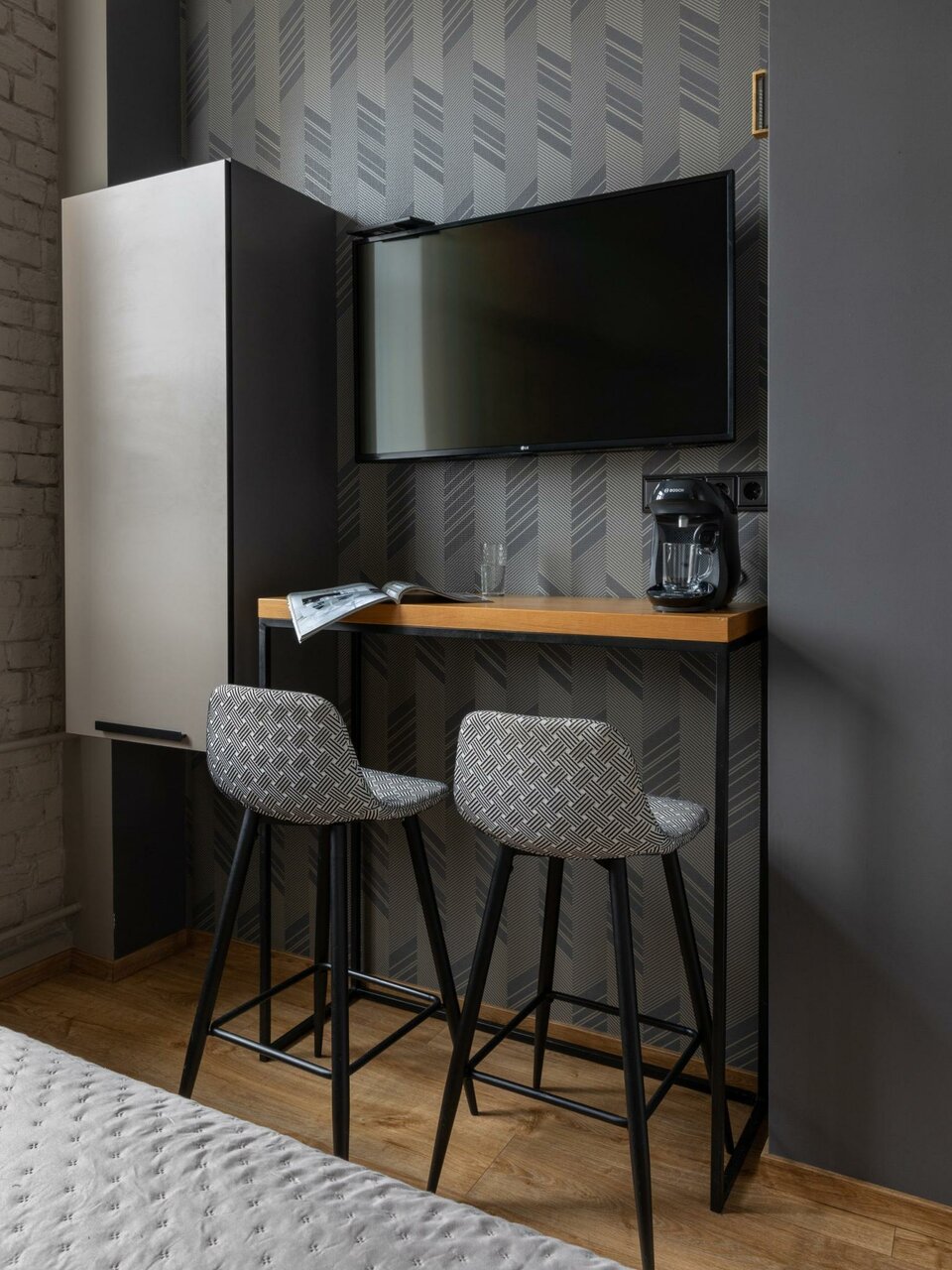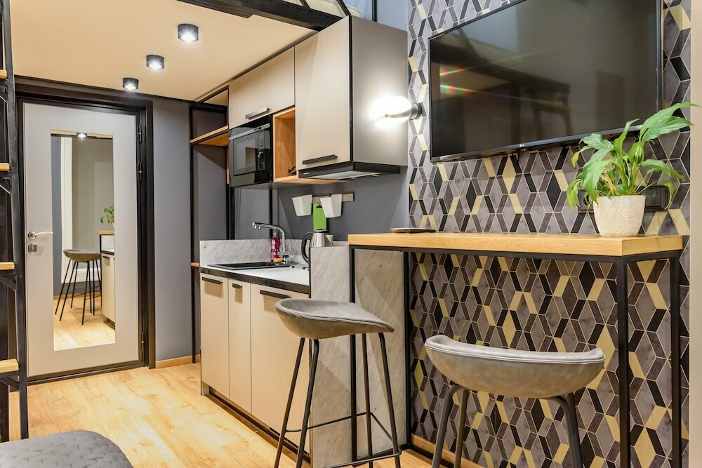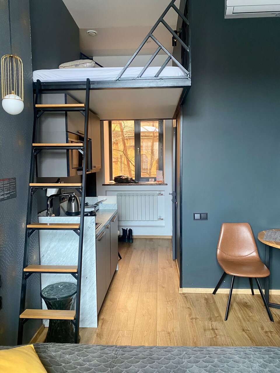 Как мне понравилось. И зона для готовки есть и все очень стильно и уютно Были на выходных с мужем вдвоем Остановились на первом этаже. С улицы нас не видно, а мы в большие окна видим набережную Прекрасное место