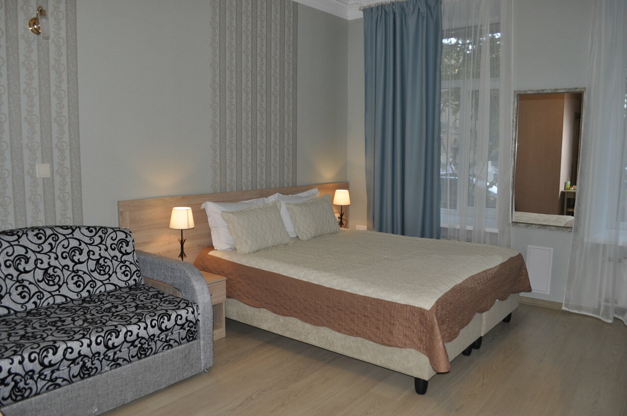 Замечательное место. Хозяин доброжелательный, внимательный. Номер удобный, комфортный, довольно просторный. Окна нашего номера выходили в тихий двор. В номере все продумано до мелочей: кровать и диван, стол, тумба, шкаф, коврики у кроватей, утюг, гладильная доска, фен, удлинитель, сушилка для белья, в коридоре стиральная машина. Отдельно порадовало, что даже ваза для цветов была! Особо хочется отметить мини-кухню с набором новой посуды и всех самых необходимых кухонных принадлежностей: моющее средство, кухонное полотенце, разделочная доска, достаточное количество столовых приборов и других мелочей, есть соль, сахар. Утром не приходилось ломать голову, где позавтракать, в номере небольшой холодильник, кухонная раковина и плита на 2 комфорки, все можно приготовить с удобством. Огромное спасибо хозяину за внимание и уют!!! Нам очень понравилось и хочется вернуться сюда снова.