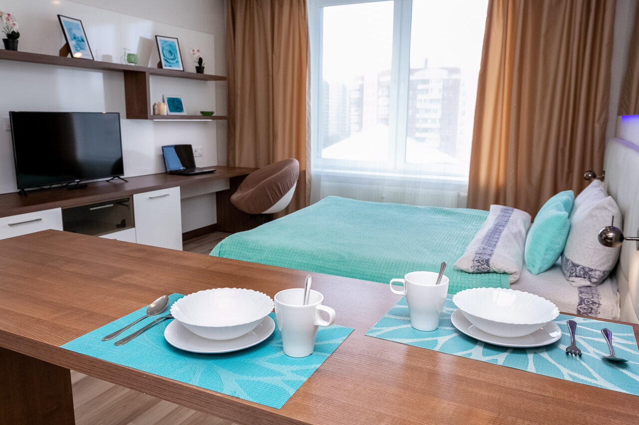 Апартамент Mint — современный и стильный номер-студия, который идеально подойдет для комфортного проживания как одиночек, так и пар. Интерьер оформлен в свежих мятных оттенках, создающих атмосферу уюта и расслабления.