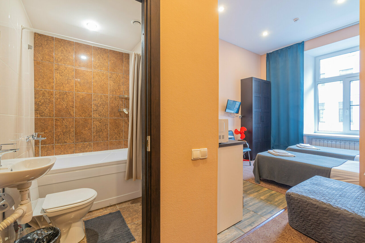 Номера в отеле я бы оценил на твёрдую 4. У нас был 4-х местный номер, спать удобно, в номере есть кухня (плита, чайник, холодильник, посуда, раковина) нет места для сушки посуды. Ванная комната удобная, но вытяжка работает когда включён свет, соответственно полотенца сохнут плохо.. Приходилось сушить все на перилах ( сушилку можно брать в коридоре, это не удобно) . В нашем номере отсутствовал кондиционер (провода были, может был на ремонте), но погода была прохладная и мы не сильно обращали на это внимание. Расположение отеля выше всяких похвал, метро Сенная площадь рядом, рынок рядом, многие достопримечательности в пешей доступности. К персоналу претензий нет. В отеле можно в холле погладить и постирать вещи. Советую к посещению.