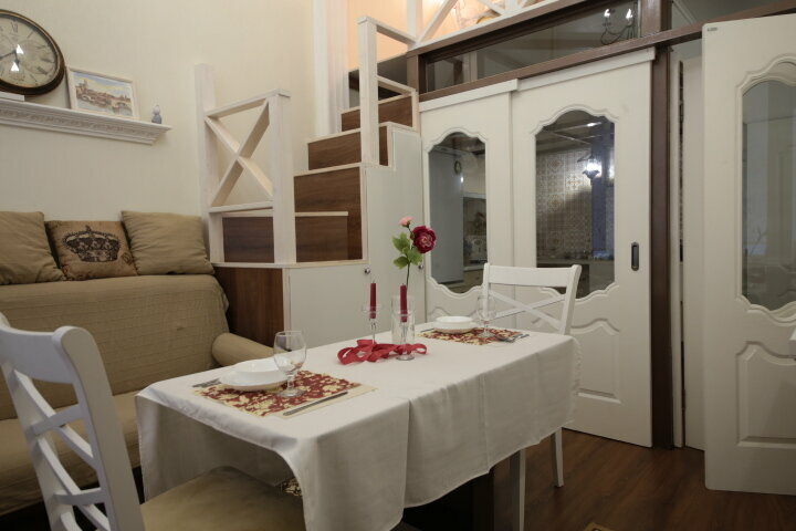 Двухкомнатная квартира двухуровневая площадью 59 кв.м с видом во двор.Подходит для размещения 7 человек (6 основных и 1 дополнительного).Имеет спальню с приятным интерьером.В номере: 1 двуспальная кровать, 2 двуспальных дивана, 1 еврораскладуш...