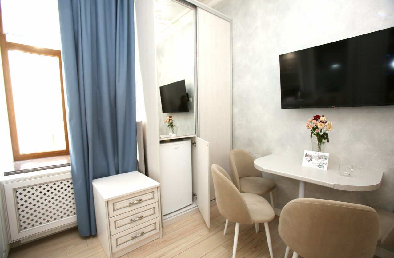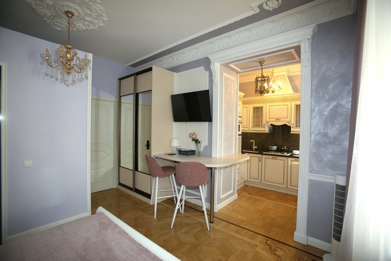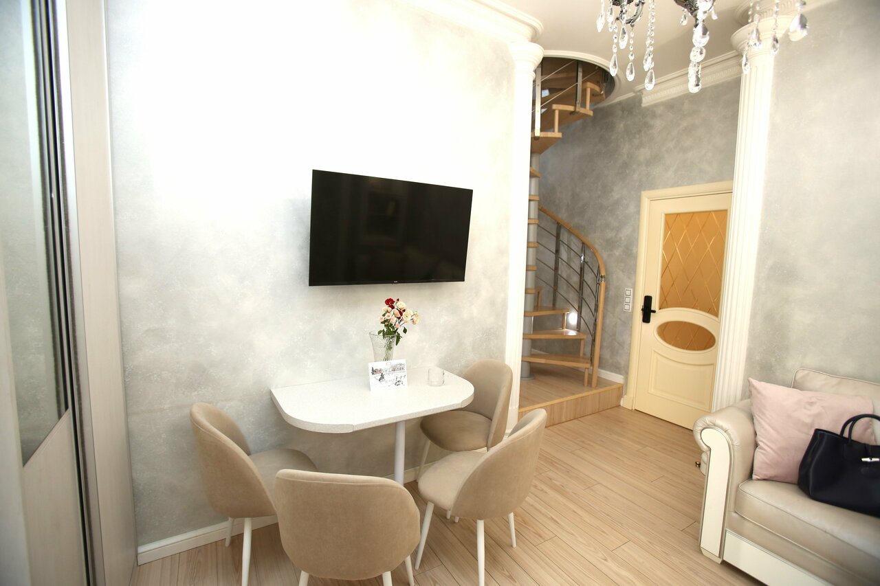 Светлая и уютная квартира-студия расположена на последнем этаже 5-этажного здания (без лифта) в историческом, культурном и бизнес центре Петербурга – прямо у Невского проспекта, Адмиралтейства и Дворцовой площади.