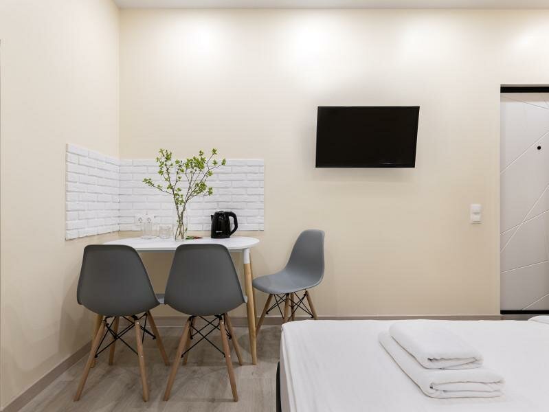 Удобное местоположение, прикольная дистанционная система заезда. Несмотря на то, что апартаменты находятся на 1 этаже, в номере очень тихо. Всё нужное в номере есть, но единственное, хотелось бы, чтобы добавили зубные наборы, их не дают( Конечно это не стоит того, чтобы снимать звёздочку, но надеюсь, что это замечание учтут
