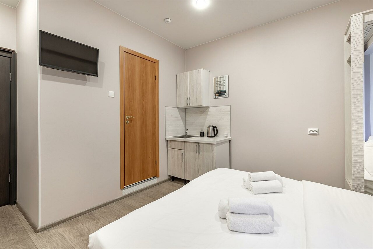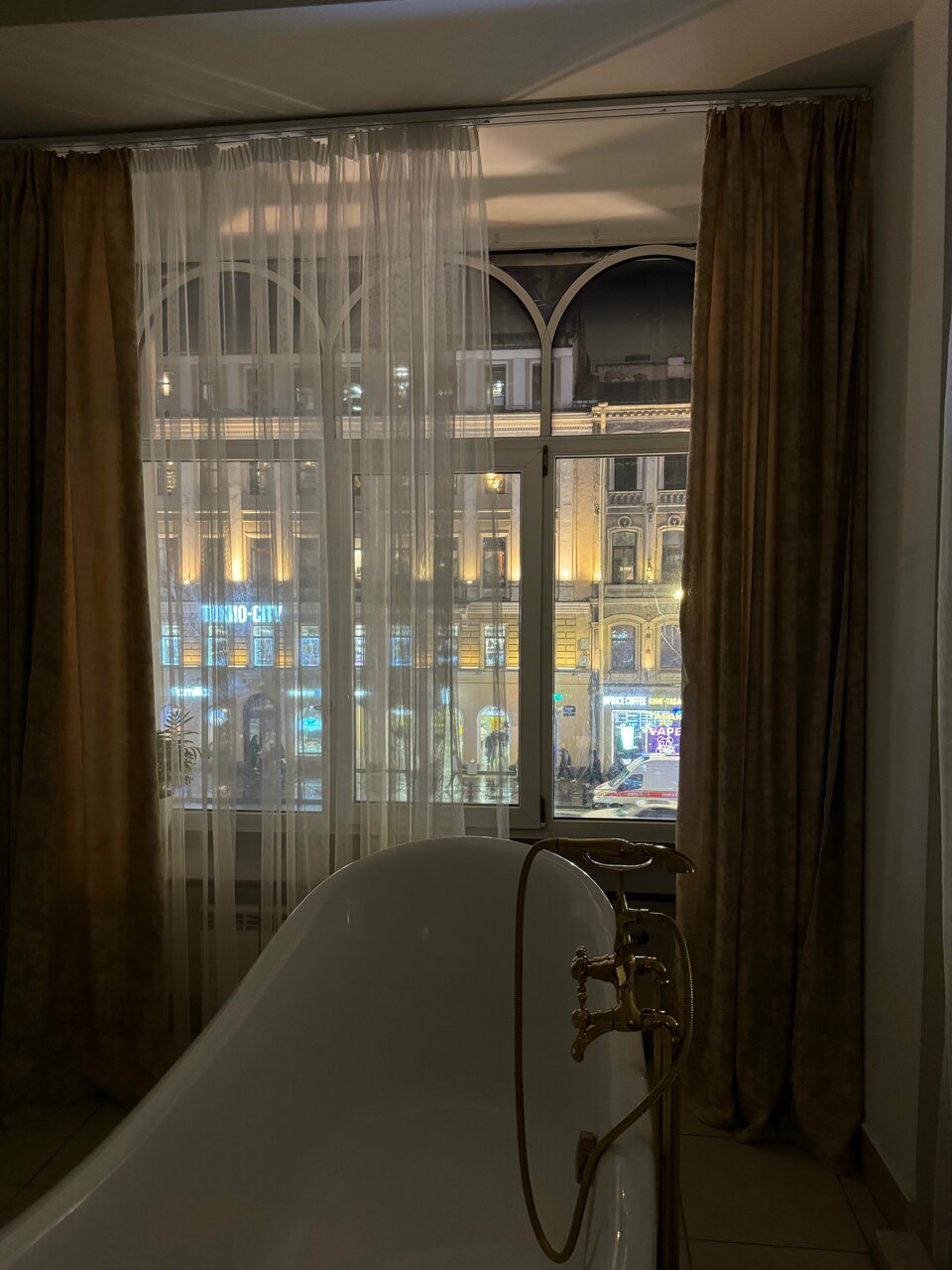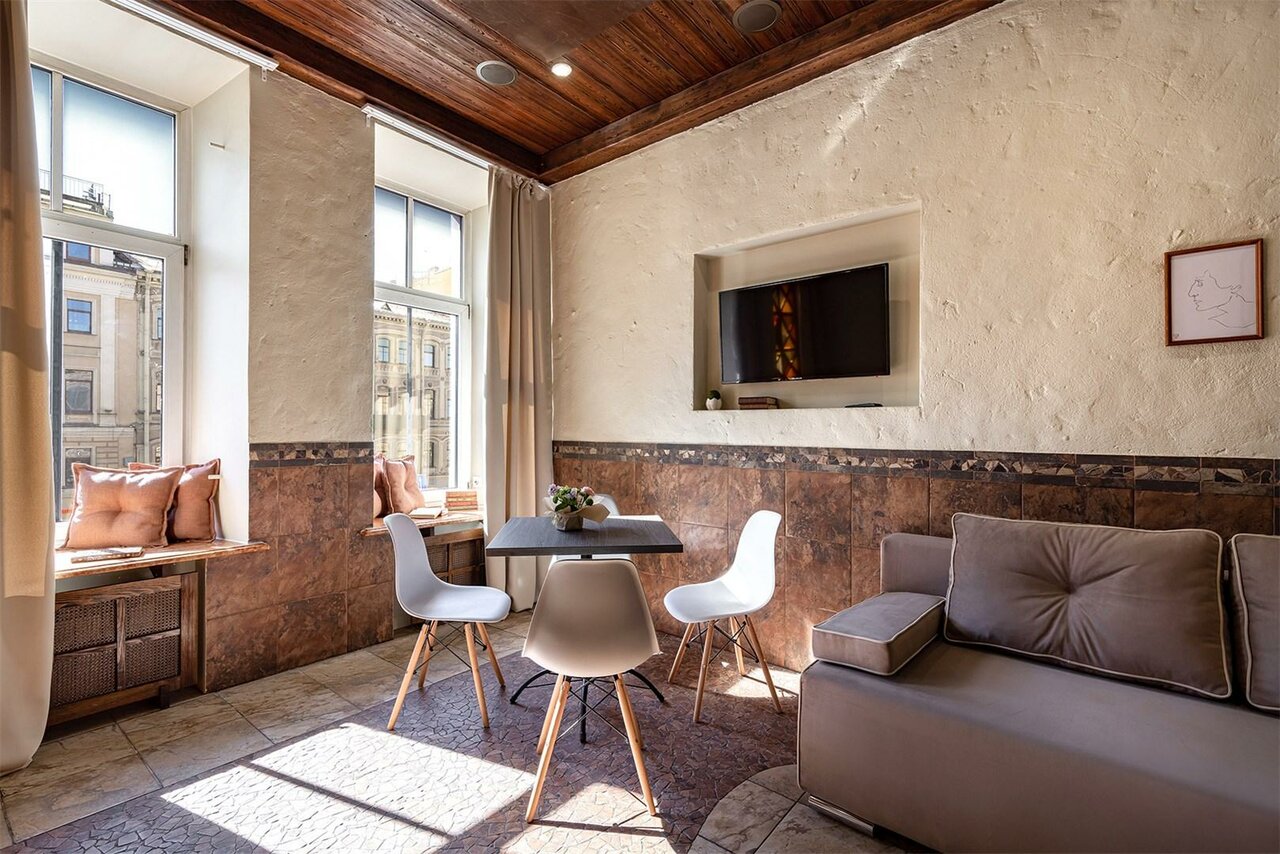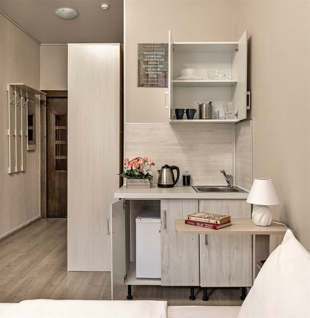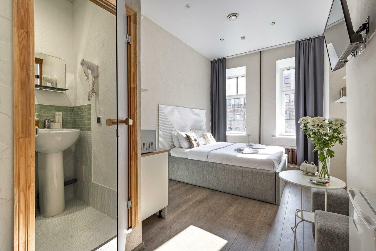 Достаточно приятный и чистый номер. Посуда, мини кухня и душ есть даже в маленьком однокомнатном номере. Есть номера с видом на Невский проспект. Виды красивые, но у нас в номере 9 был минус, окна не до конца закрыты и в номере гулял ветер. При температуре на улице минус 2 было не приятно. Слава богу температура была не минус 20, иначе бы замерзли. А так все отлично.