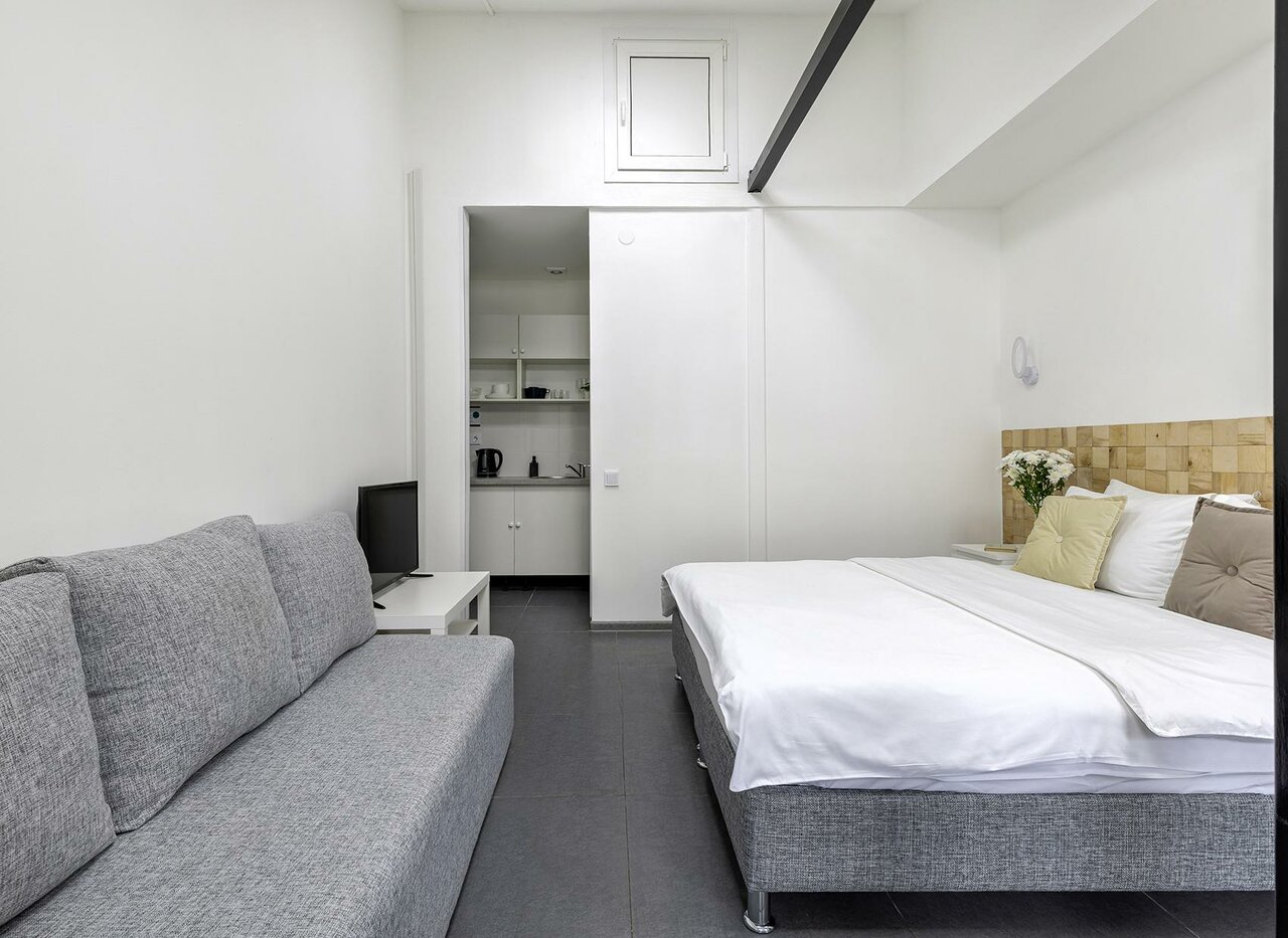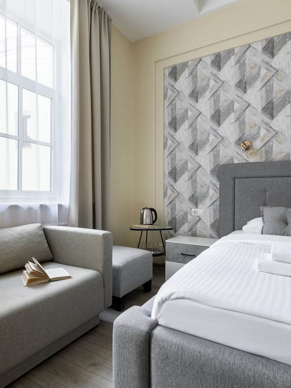 Номер категории комфорт находятся на 4 этаже порядка 25 м. кв. идеально для двоих. Возможно трехместное размещение. Третье спальное место представлено раскладной кроватью диваном.