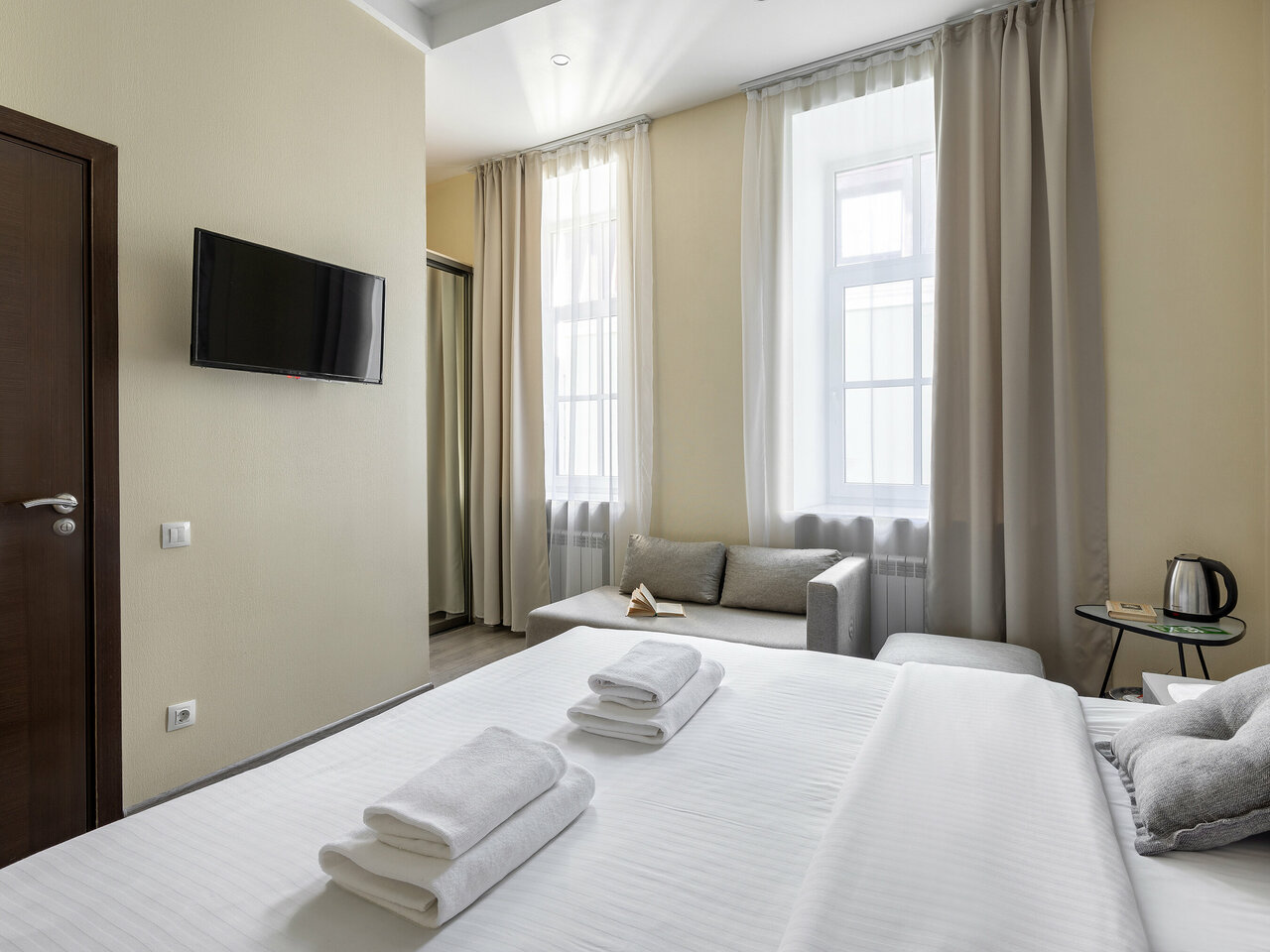 Уникальные номера на 5 этаже с видом на петербургские крыши и двор. Отличный выбор для семьи (трехместное размещение), молодой пары.