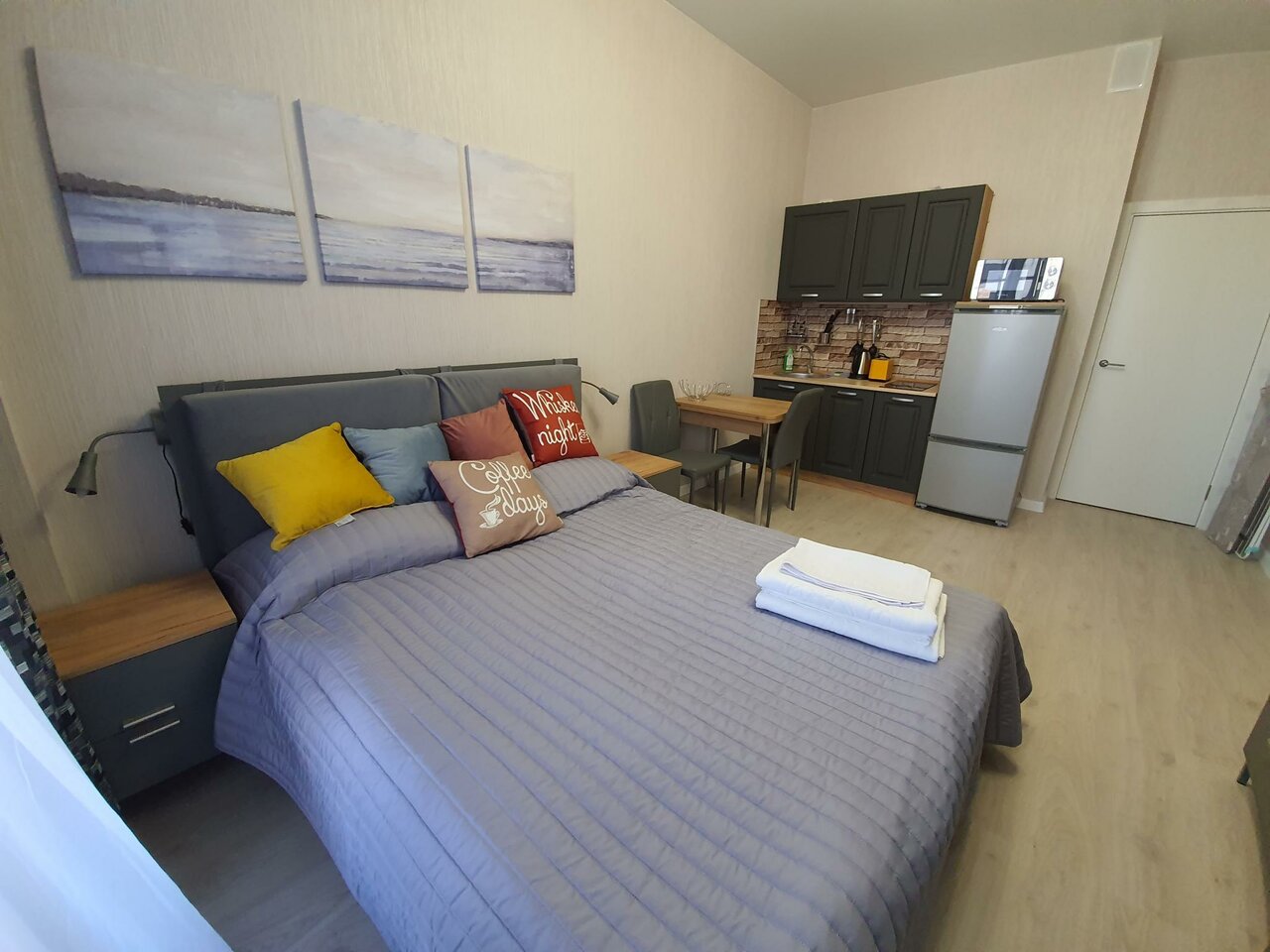 Суперские апартаменты. Бронировали в день заселения через Яндекс путешествия, очень быстро после брони отписался менеджер в вотсапе, все объяснил и заехали. Обязательно как будем в СПб, остановимся тут