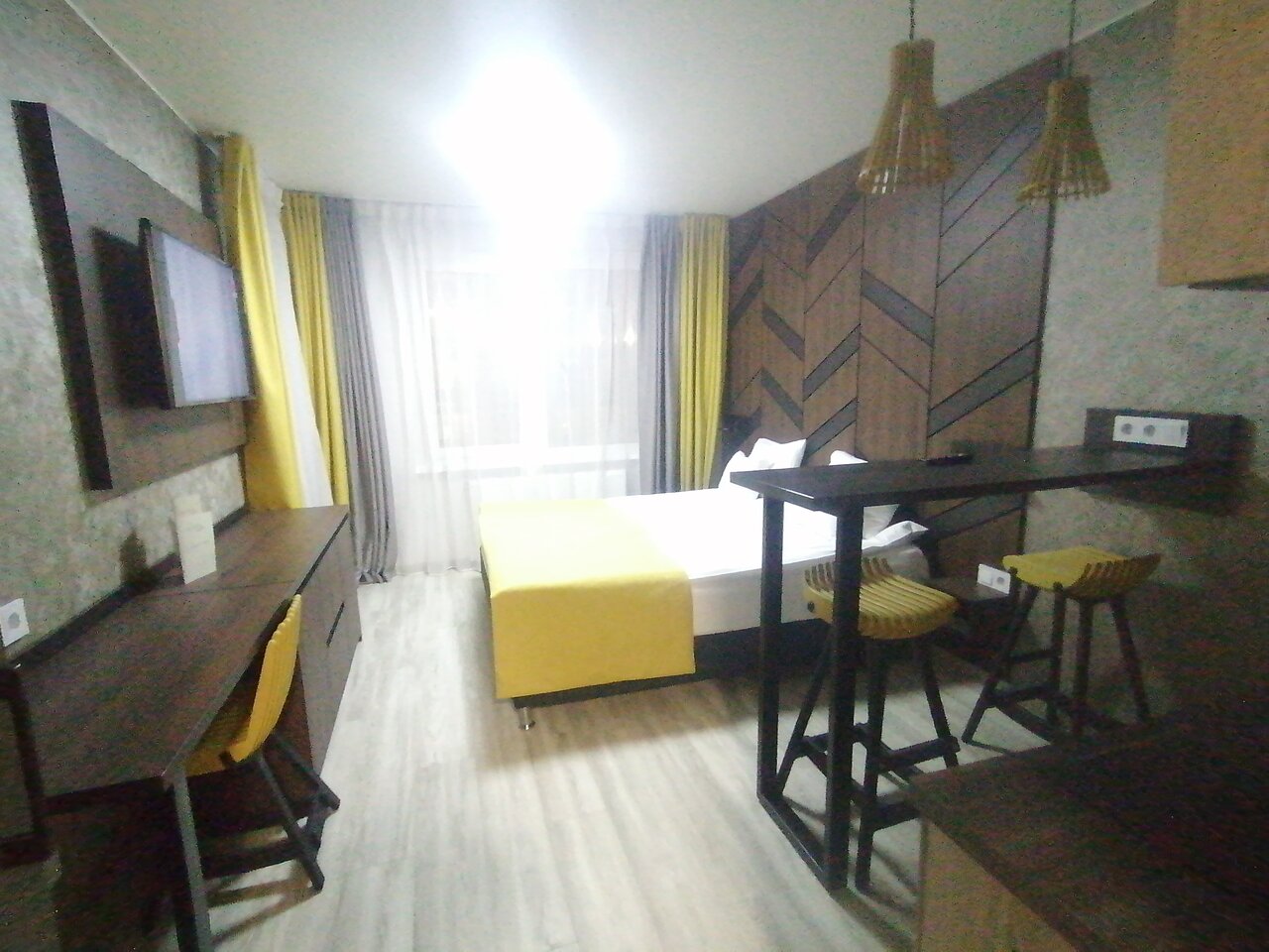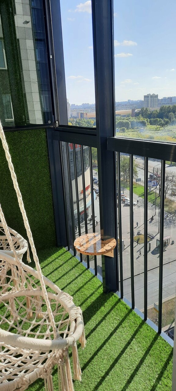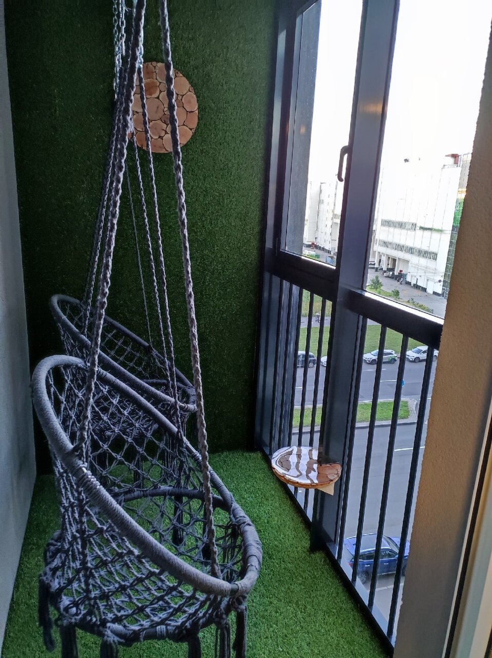 Светлые и функциональные апартаменты площадью 26 кв.м., с собственной кухней, балконом и шикарными креслами-качелями с видом на город. Можно с питомцем!