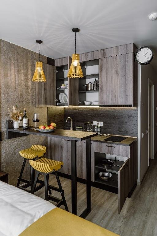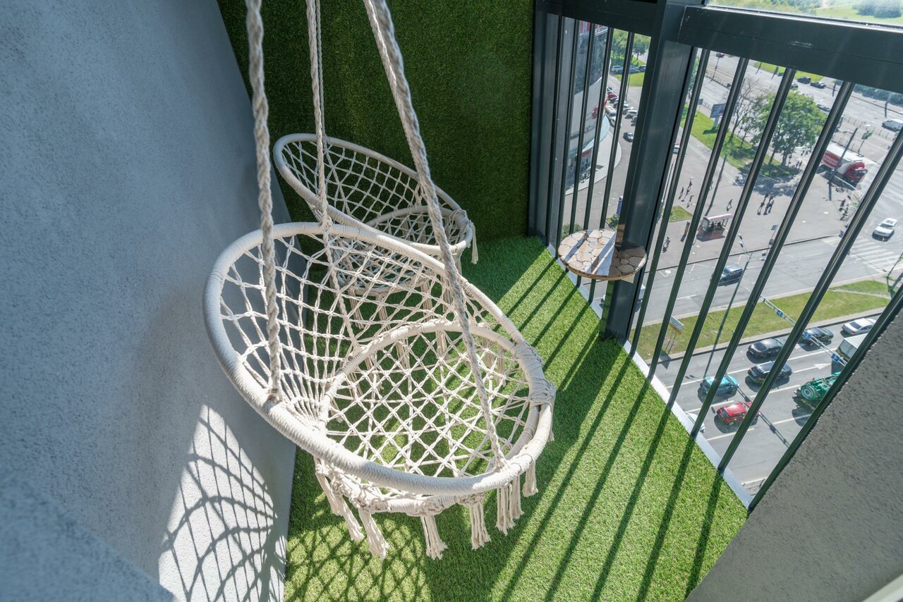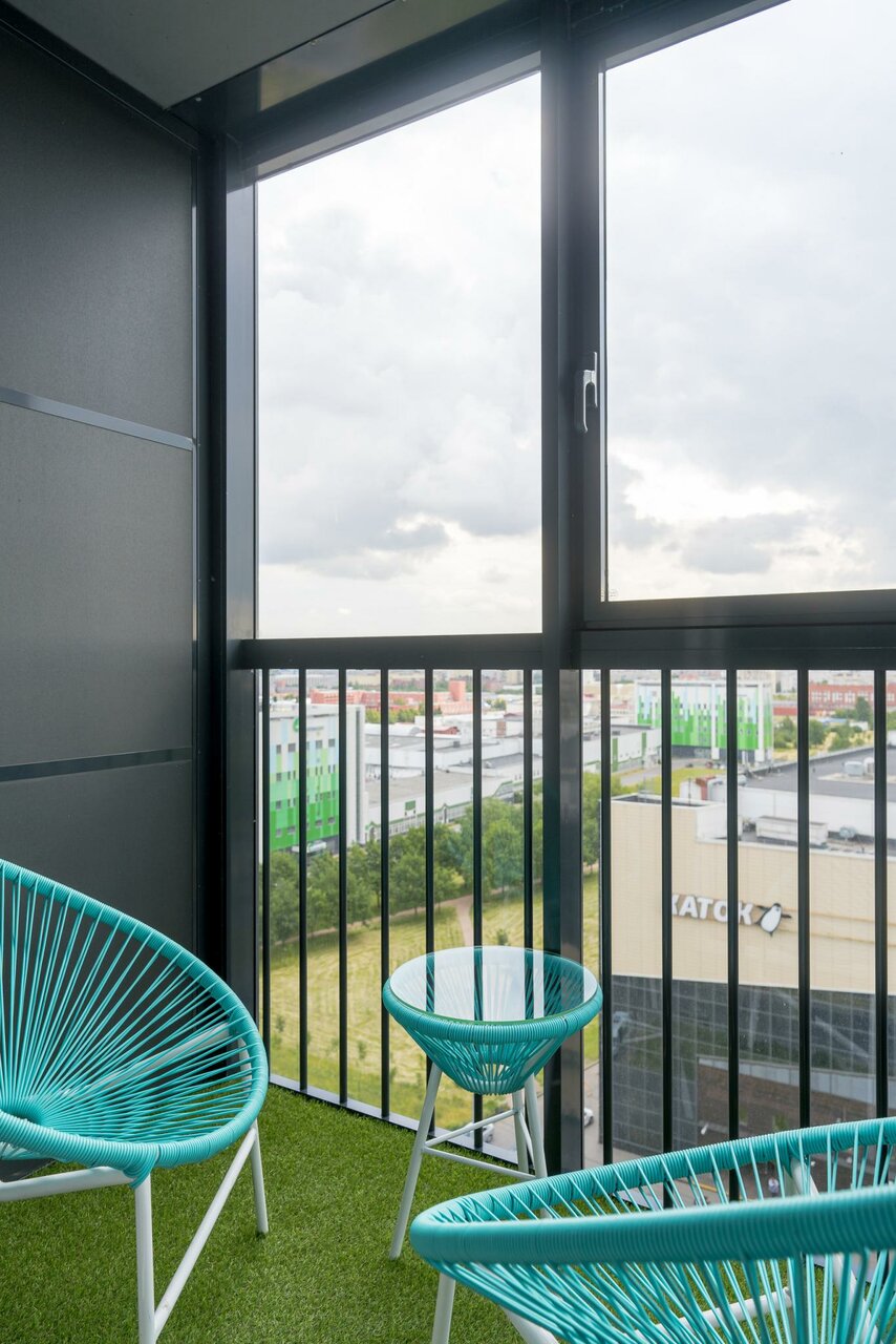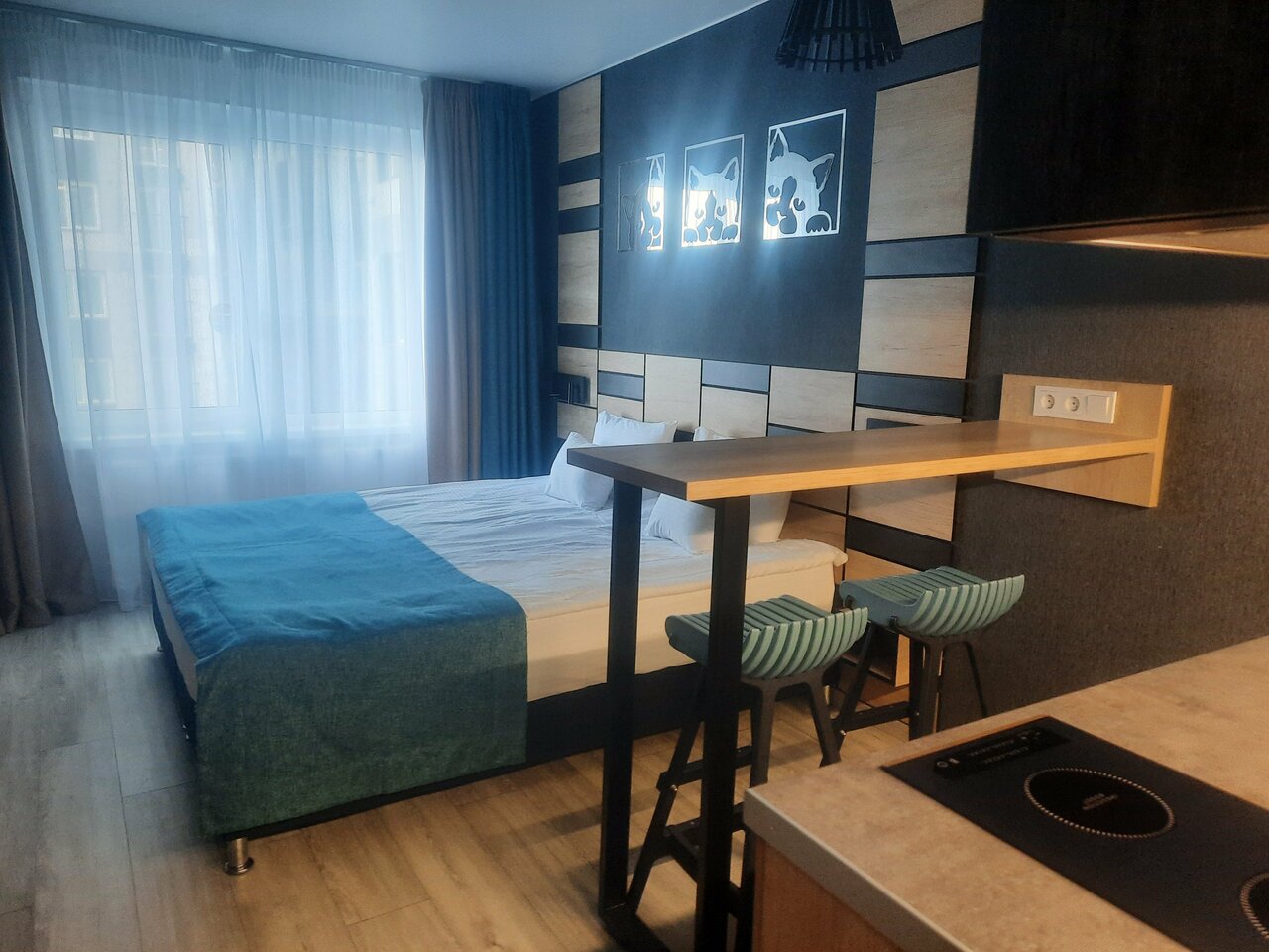 Светлые и функциональные апартаменты площадью 26 кв.м., с собственной кухней, балконом и шикарными креслами-качелями с видом на город. Можно с питомцем!