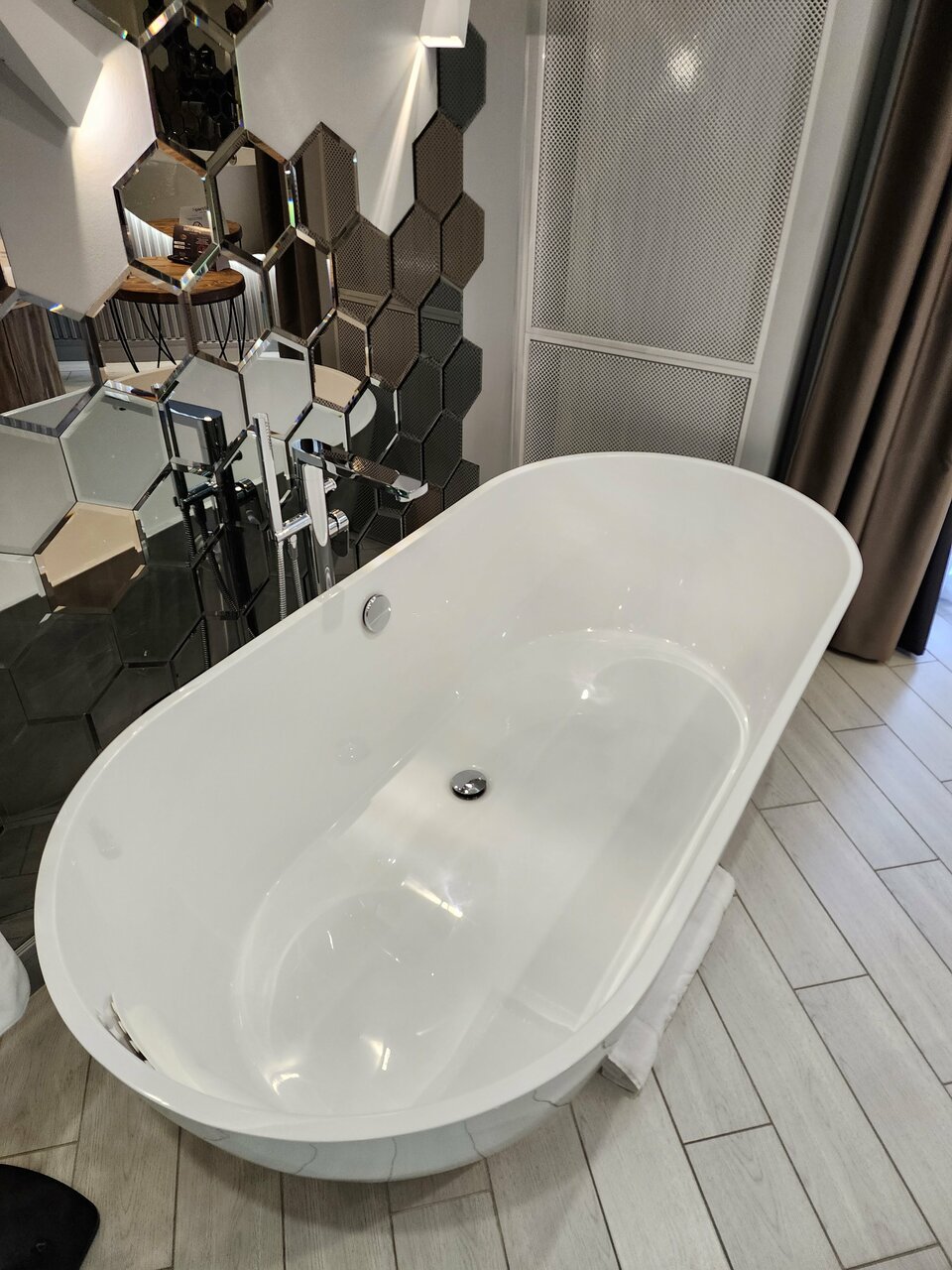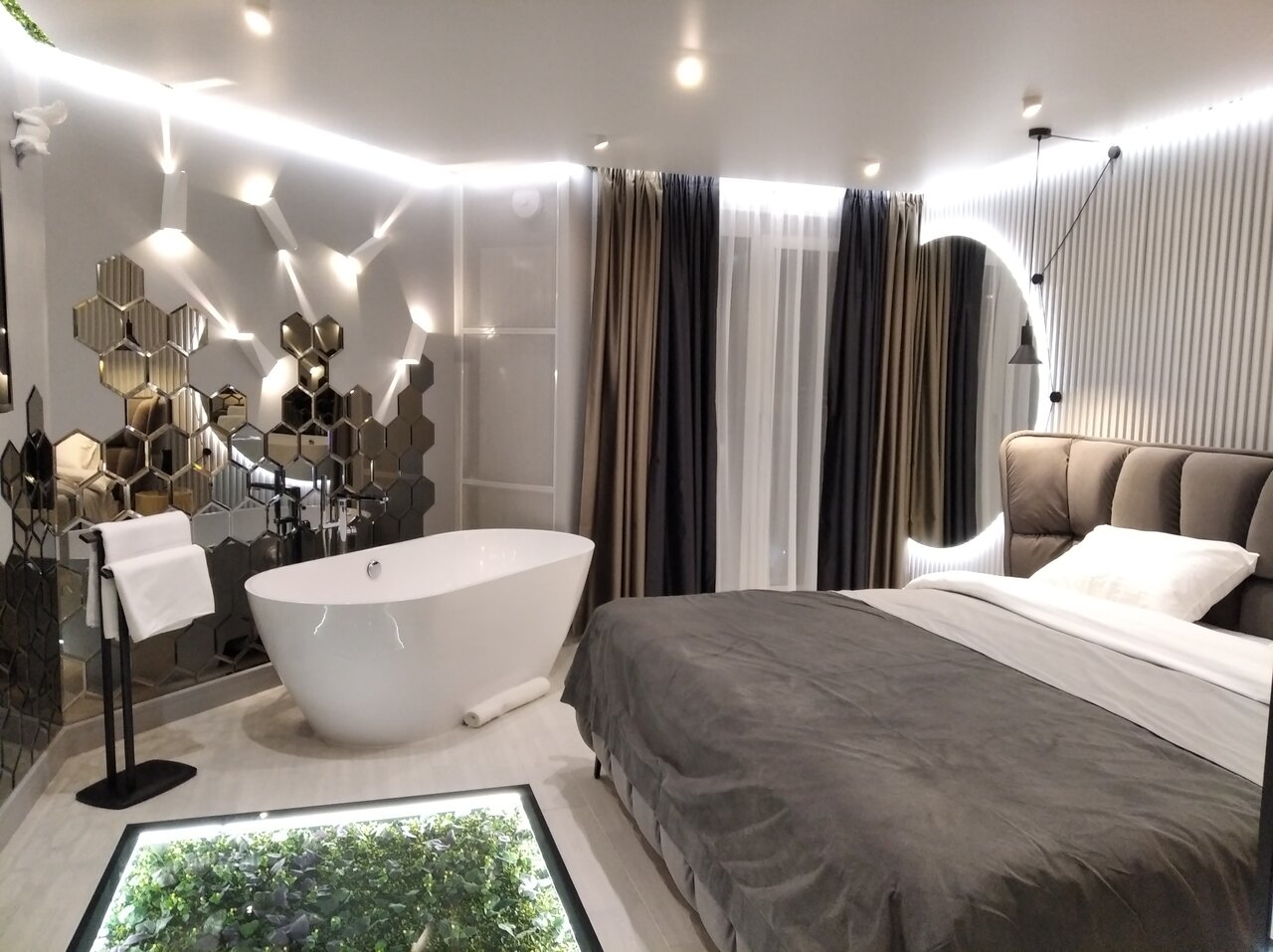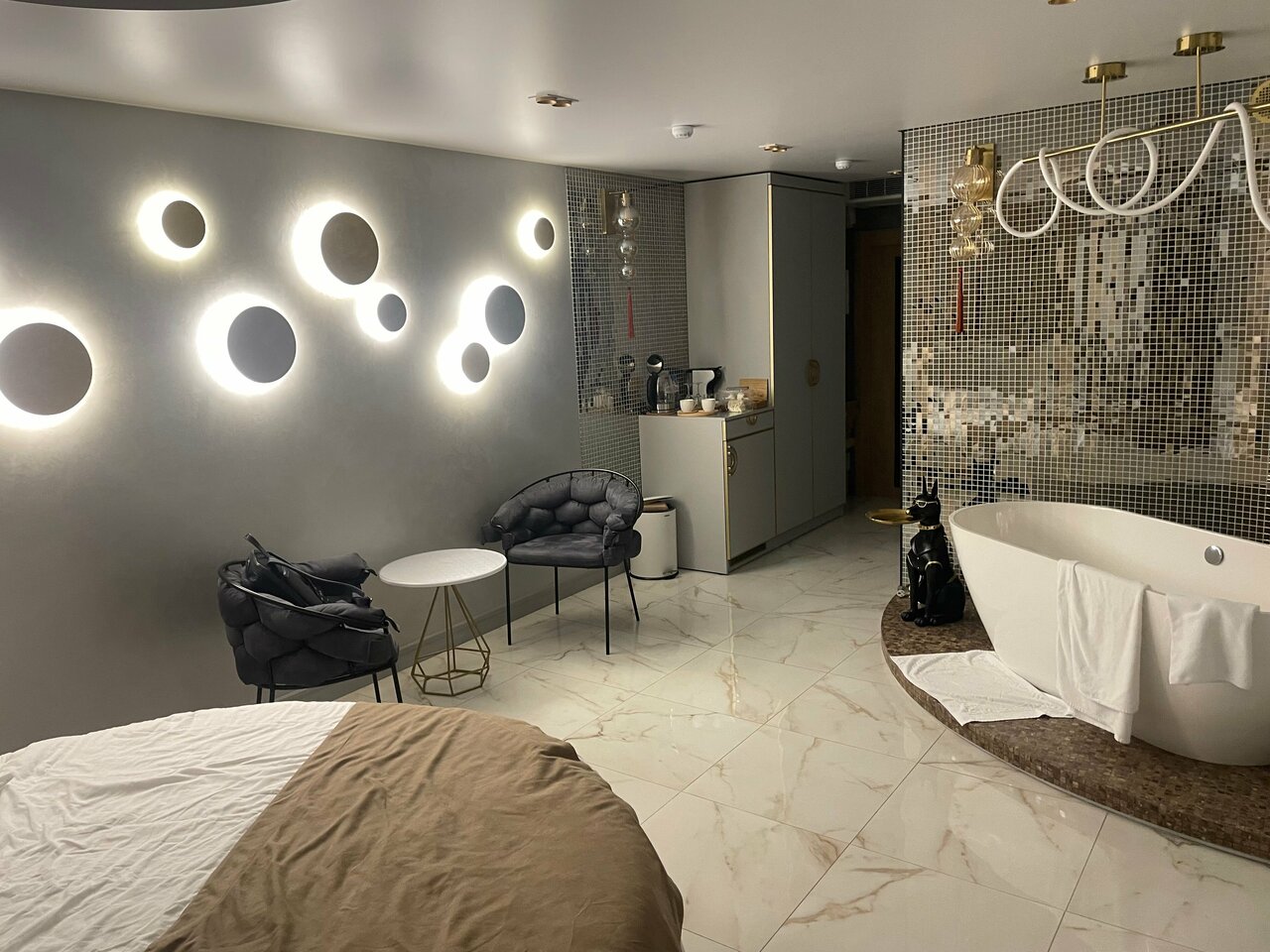 Шикарный дизайнерский номер 25 кв.м. Круглая кровать с расположенной перед ней просторной ванной задаёт атмосферу романтики. SmartTv, WiFi, кофемашина, косметика, халаты и тапочки - всё для вашего комфорта и отдыха!