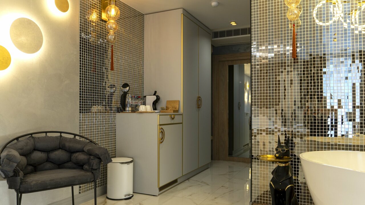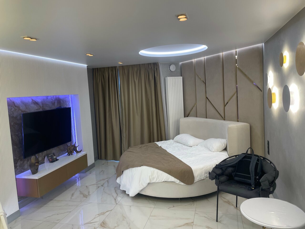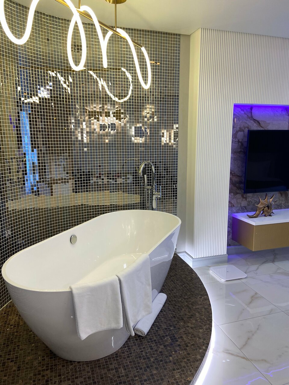 Шикарный дизайнерский номер 25 кв.м. Круглая кровать с расположенной перед ней просторной ванной задаёт атмосферу романтики. SmartTv, WiFi, кофемашина, косметика, халаты и тапочки - всё для вашего комфорта и отдыха!