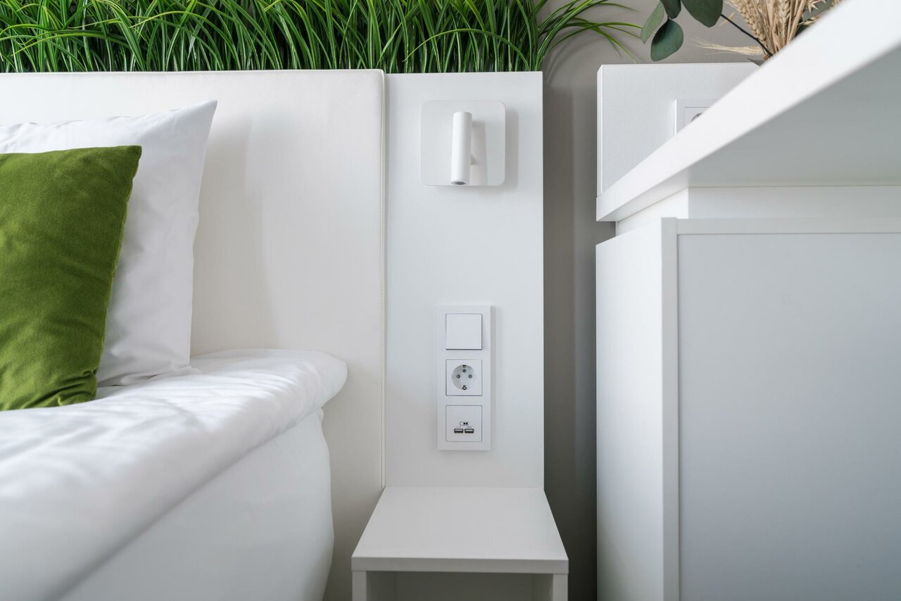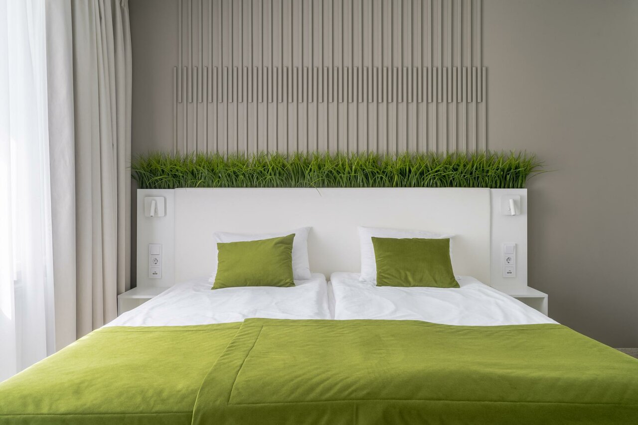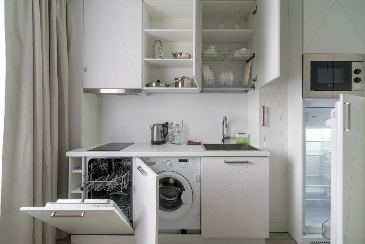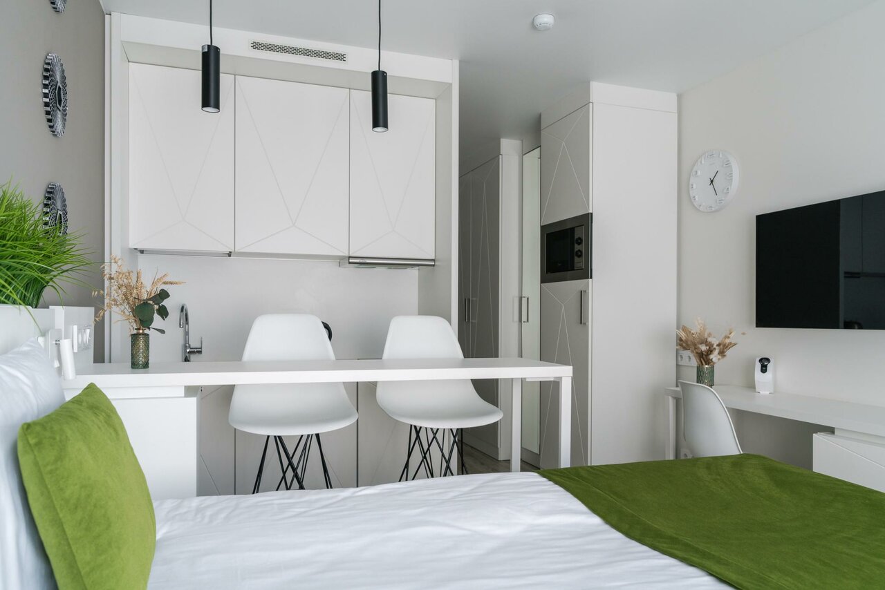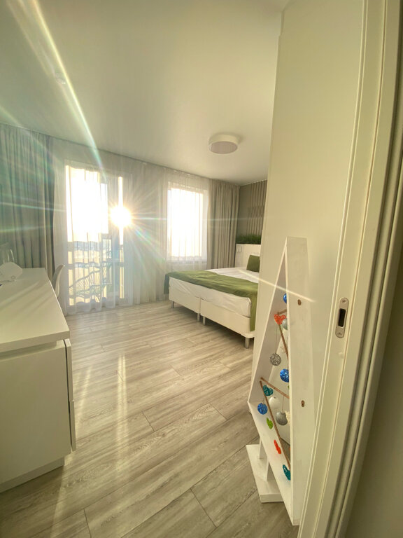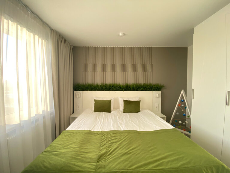Апартаменты выполнены в светлых тонах с добавлением ярких зелёных акцентов.К вашим услугам спальная зона, кухня с посудомоечной машиной и собственная ванная комната. с косметическими принадлежностями, полотенцами и тапочками.Можно с питомцем!