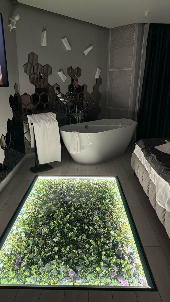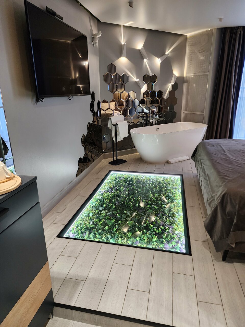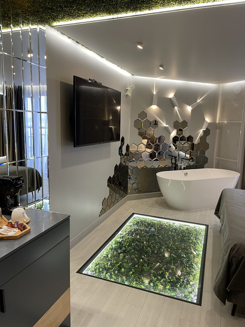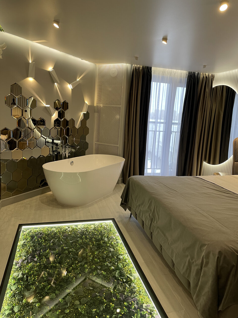 Уникальный номер, утопающий в зелени и зеркалах, с широкой кроватью с мягким изголовьем, отдельно стоящей ванной и душевой с прозрачной стеной.SmartTv, WiFi, кофемашина, косметика, халаты и тапочки - всё для вашего комфорта и отдыха!
