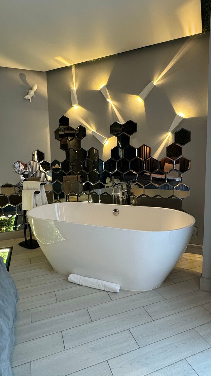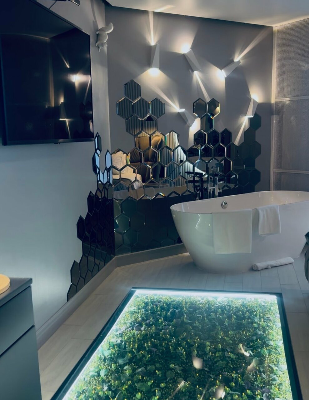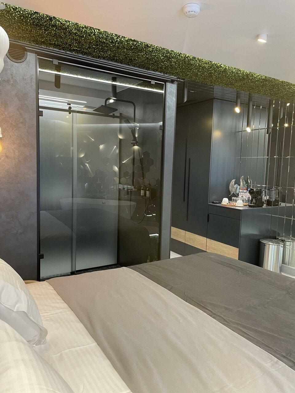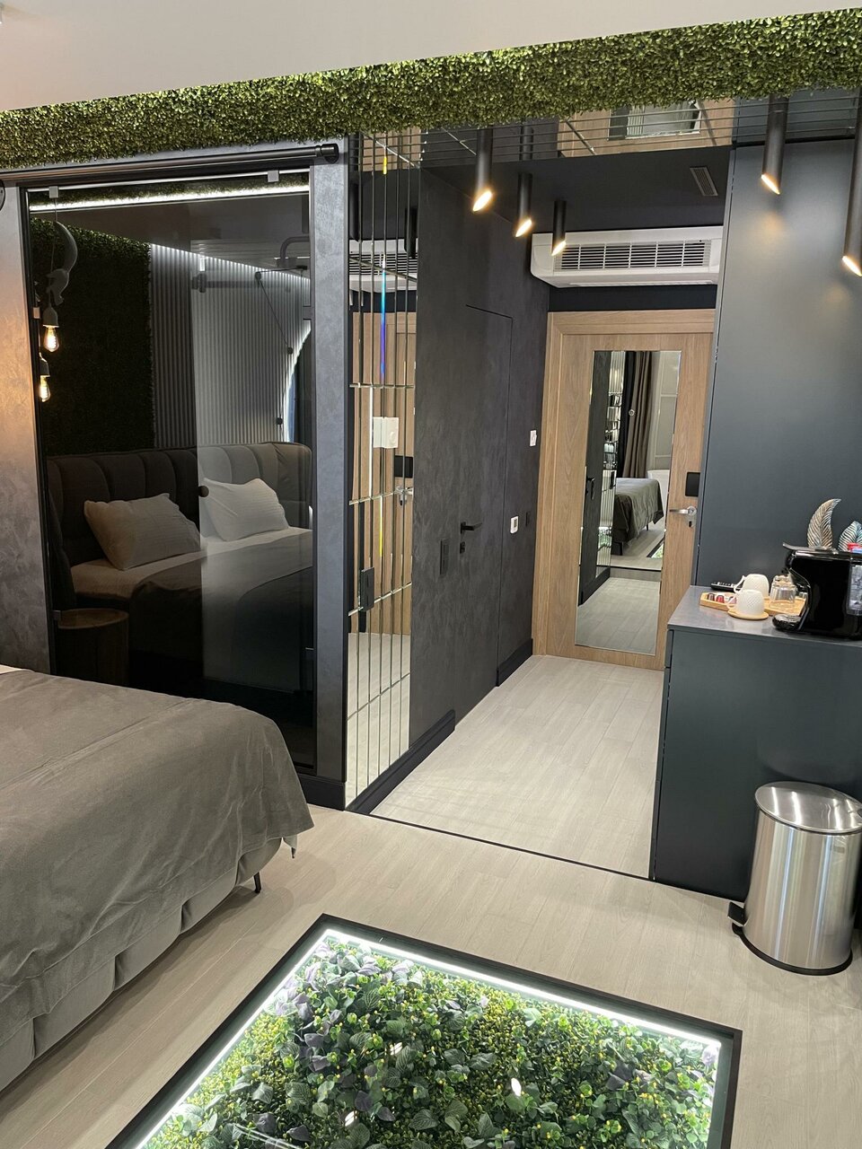 Уникальный номер, утопающий в зелени и зеркалах, с широкой кроватью с мягким изголовьем, отдельно стоящей ванной и душевой с прозрачной стеной.SmartTv, WiFi, кофемашина, косметика, халаты и тапочки - всё для вашего комфорта и отдыха!