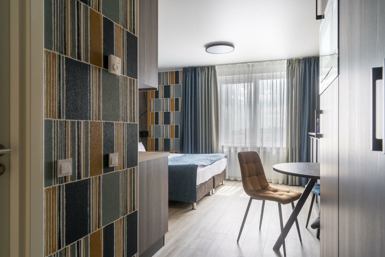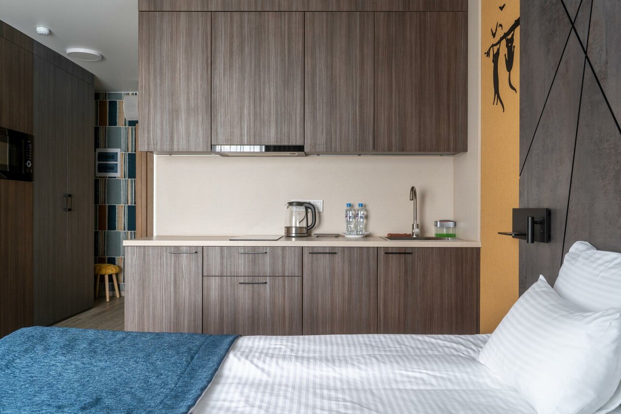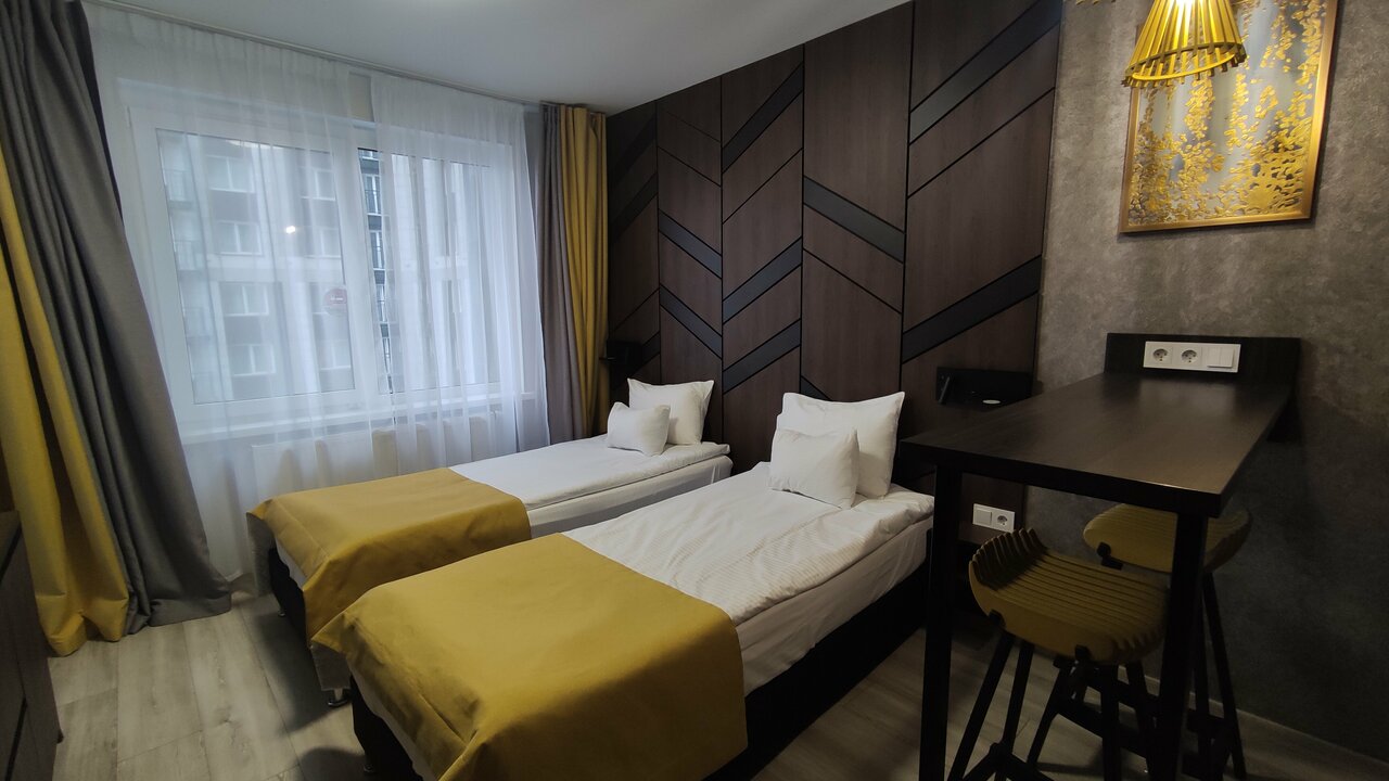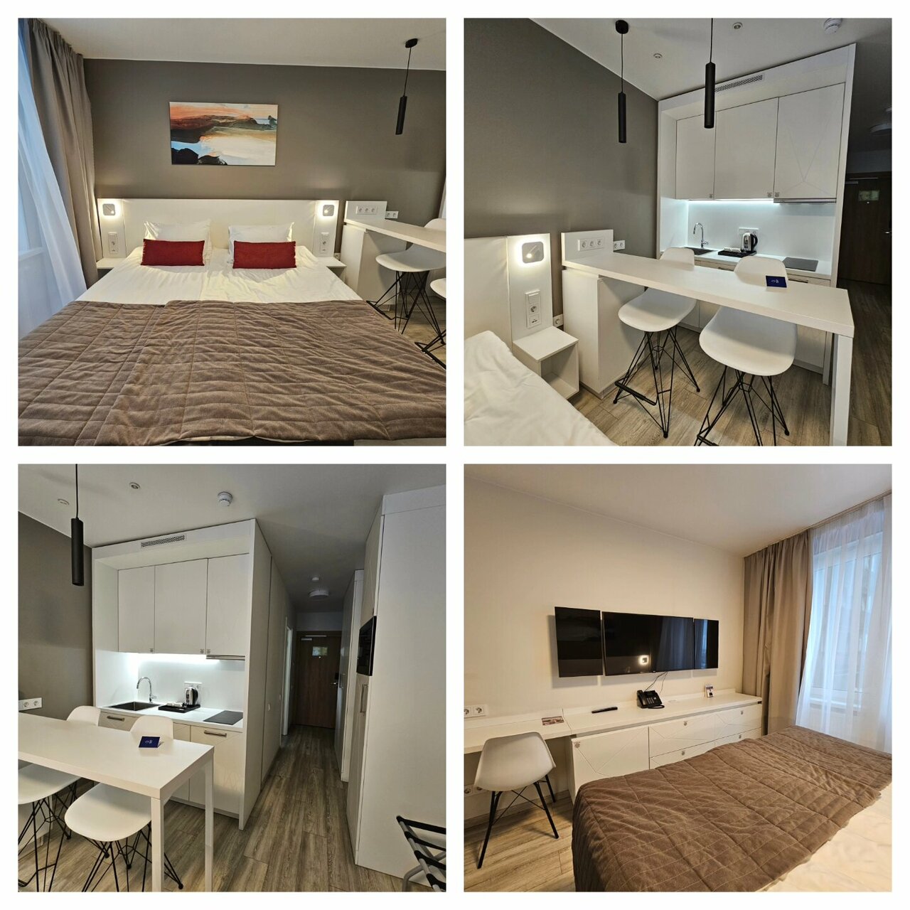 Отличный отель, номера новые, с современным интерьером, в номере есть все необходимое, от usb зарядок, до смарт тв, а так же: посуда, утюг, стиральная машина, центральный кондиционер, уборка каждые три дня, полотенца, тапочки, гель, шампунь и даже таблетки для стирки (мелочь, но приятно). Сам комплекс представляет собой закрытую территории на которой располагаются магазинчики на любой вкус; готовая еда, бар, бистро, ресторан, магазины, услуги салона красоты, кальян, фитнес зал с бассейном и многое другое, 5 мин пешком до метро и 20 мин до центра города, соотношения цена-качество, рекомендую к проживанию