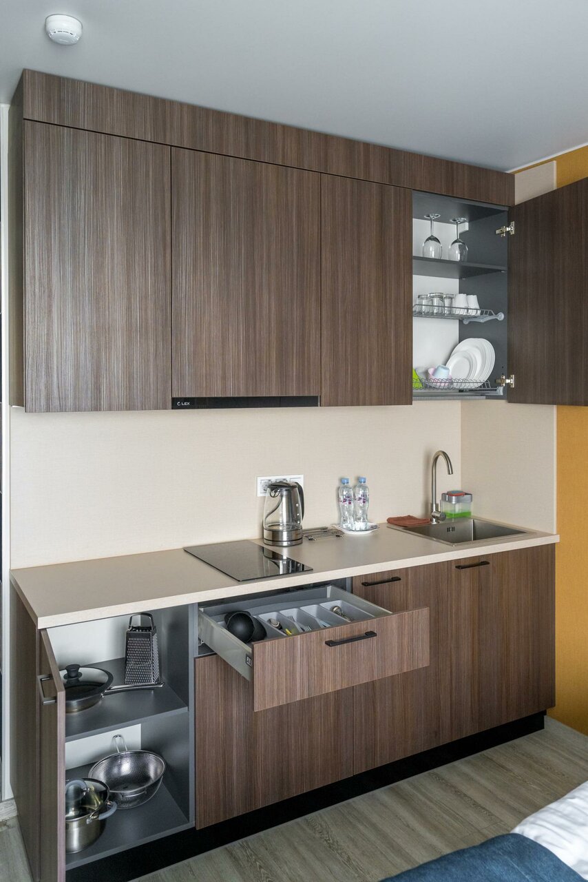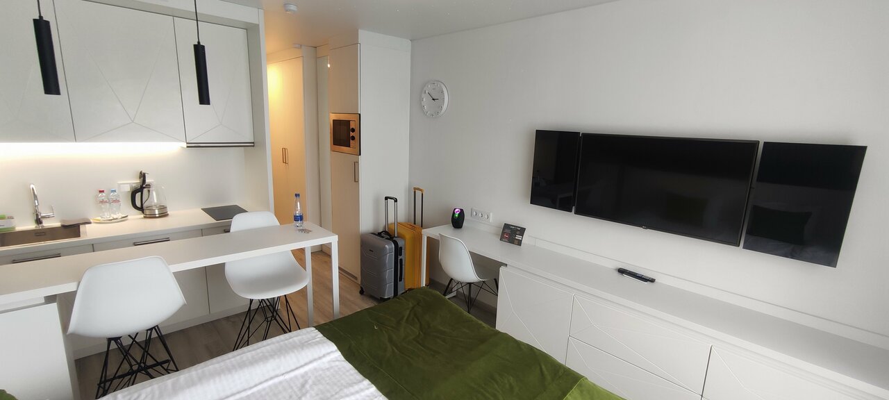 - Идеальная чистота.; Уборка раз в три дня.; Тихие и уютные апартаменты.; Много закусочных и кофеен в комплексе.; Наличие кухни, стиральной машины, фена, USB-зарядок, смарт-TV.