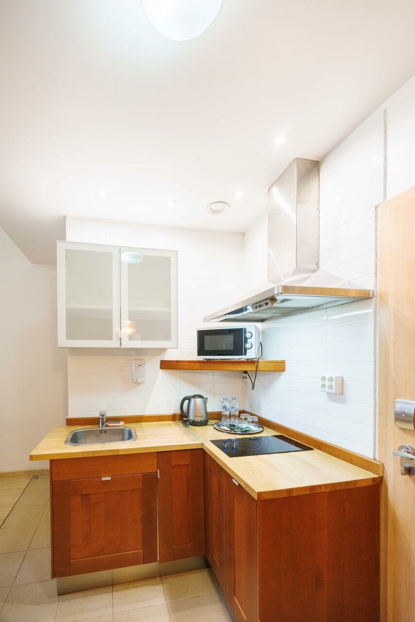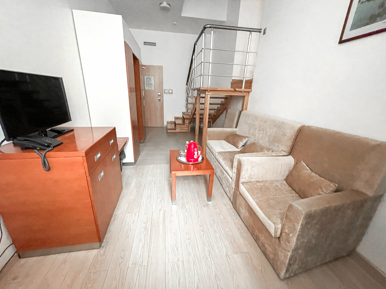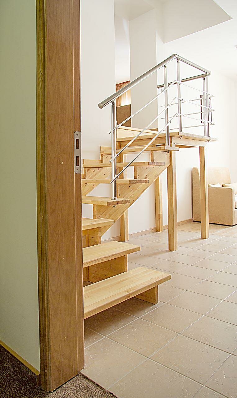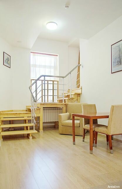 Аппартаменты - Просторный номер площадью более 47 кв.м., состоящий из двухуровневых комнат. Нижний уровень номера – гостиная с небольшой кухней и сан. узлом, верхний уровень- спальная комната с выходом в сан. узел.