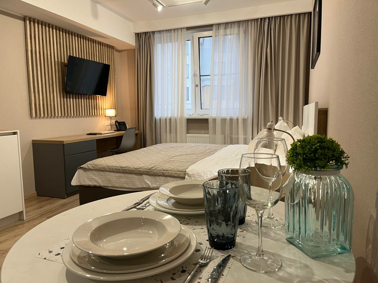 Отличные апарты! Самые лучшие в которых останавливалась. Чистые, очень удобная кровать и удобно было готовить. Всё по просьбе принесли — доп кровать, доп набор для 3го человека.