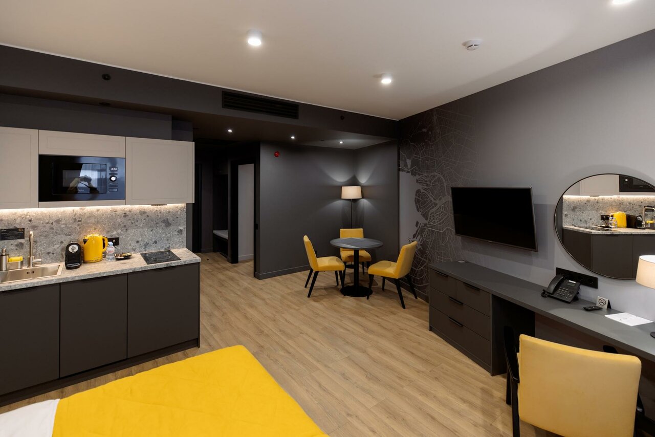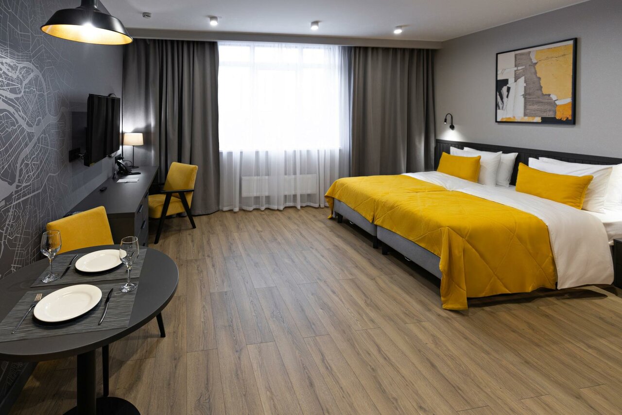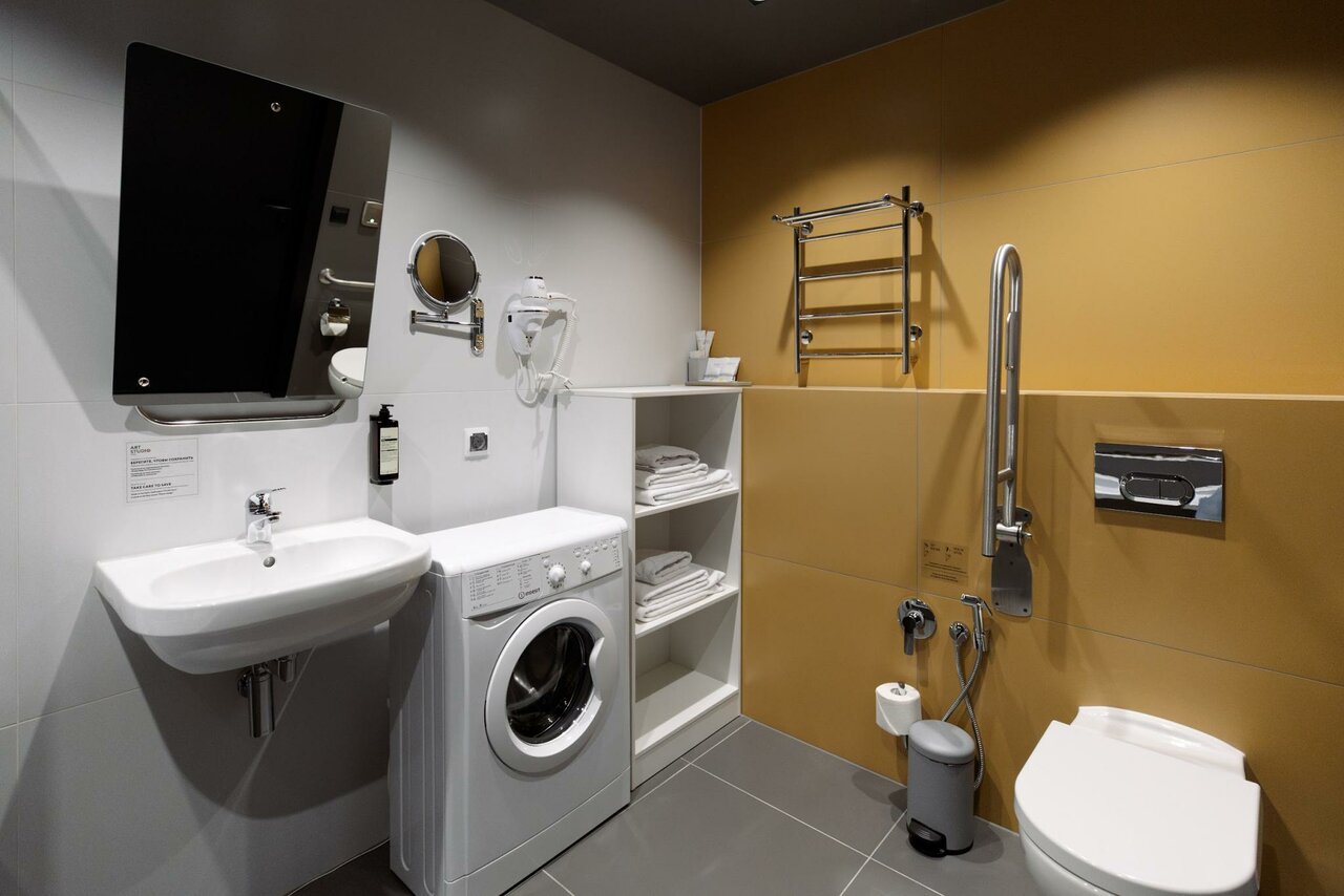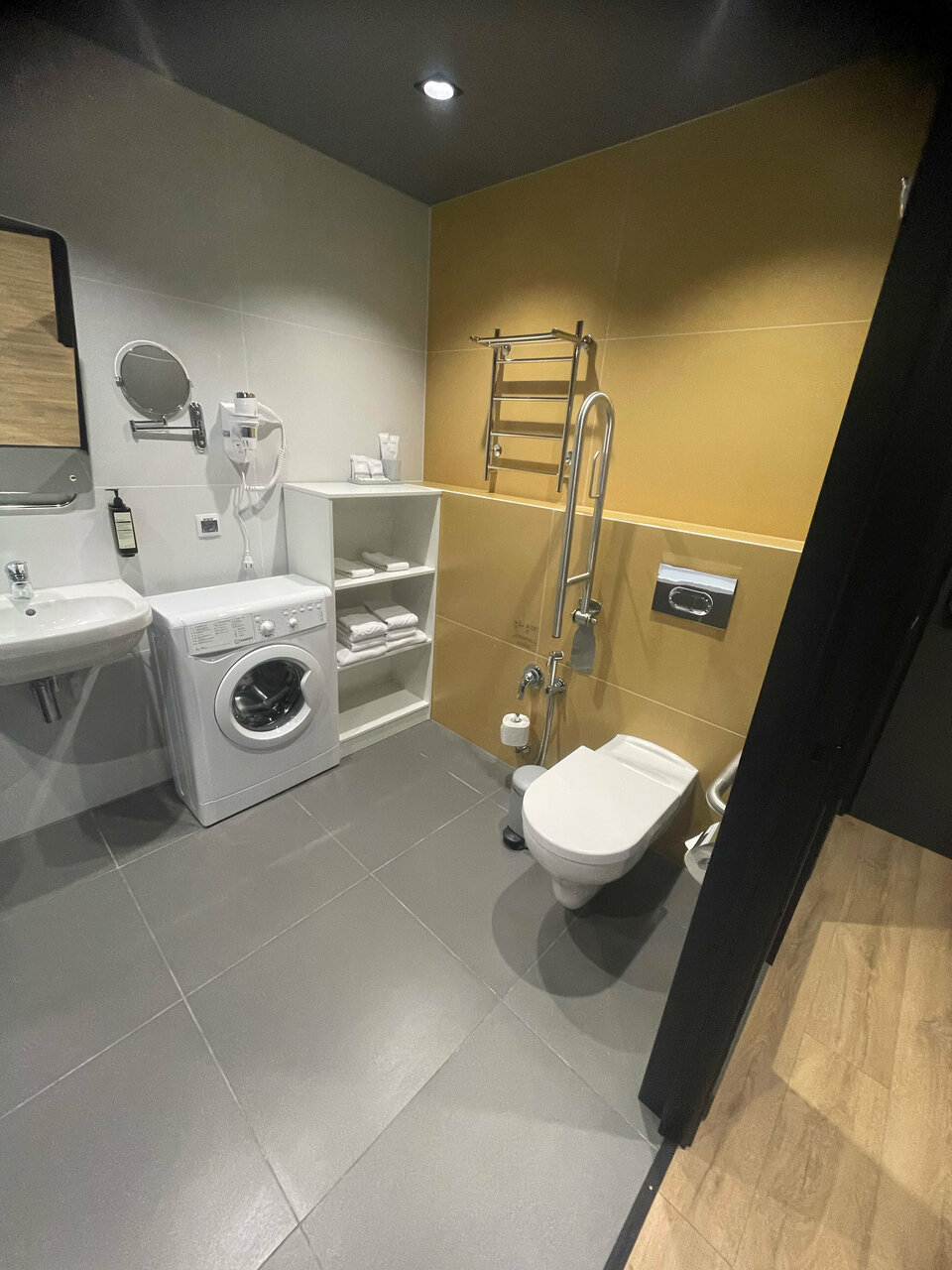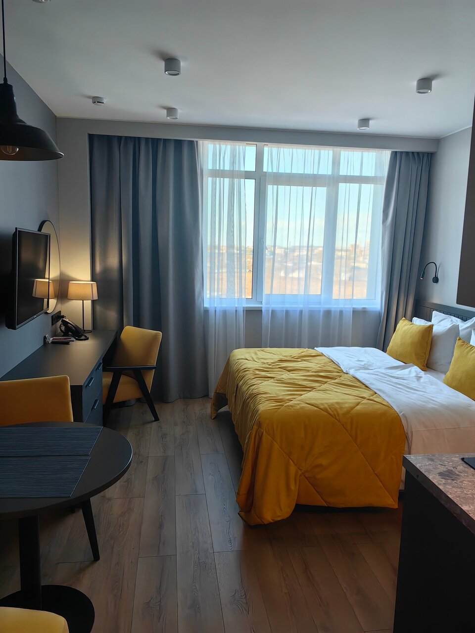 Прекрасный и современный апарт отель. Ставлю его в ряд любимых отелей. Посетил номер Deluxe за вполне скромные деньги. В номере очень просторно и уютно. Места полно для всего. Централизованная система вентиляции работает тихо, практически не слышно. Так совпало, что этот номер подходит для людей с повышенными потребностями: широкие дверные проемы, поручни там где это необходимо. Сантехника качественная и удобная. Кровать довольно широкая, мягкая и удобная. Куда бы не упал взгляд, чего бы не коснулся везде все на отлично. Особенно радуют простые и нужные мелочи, как прикроватные type-c розетки для зарядки телефона.