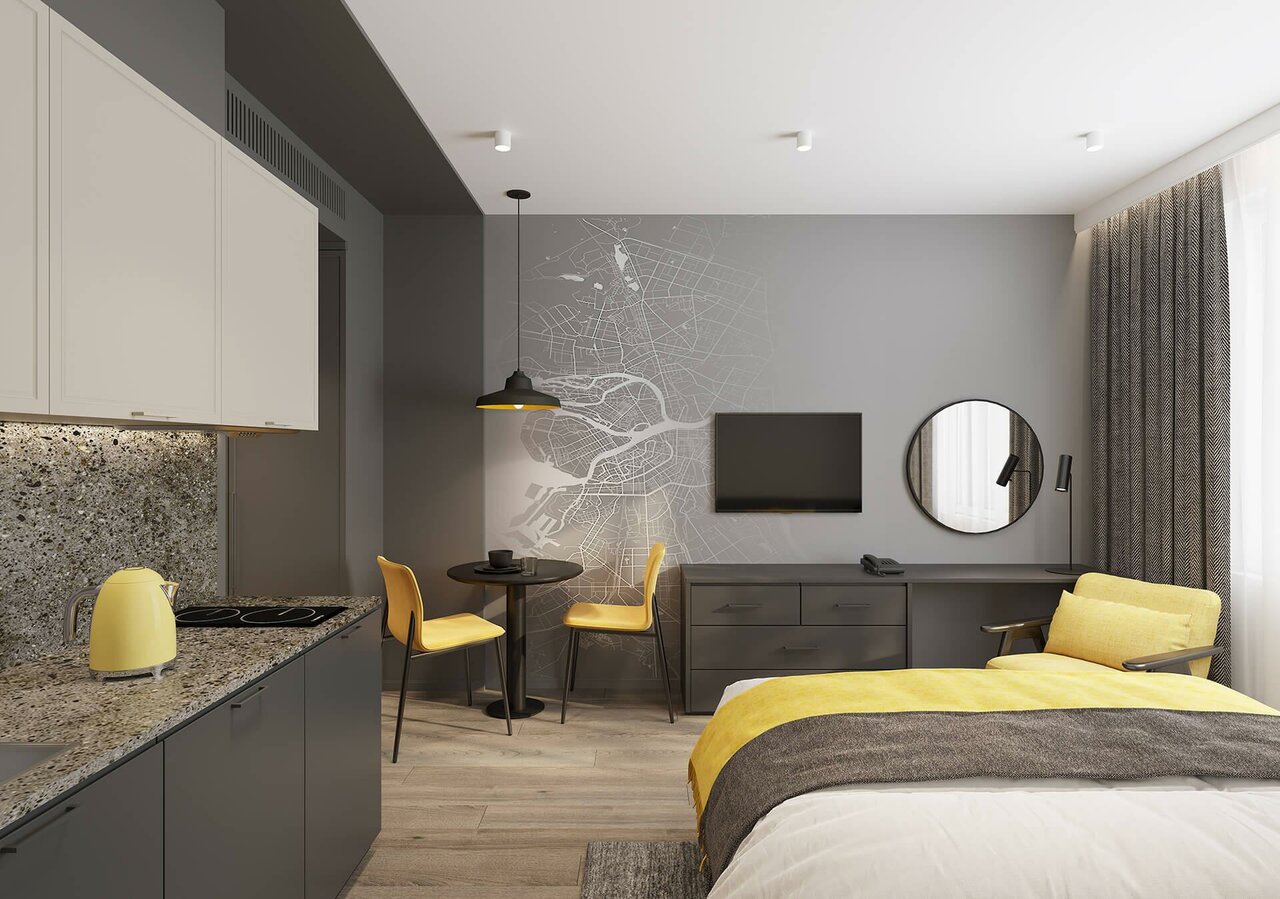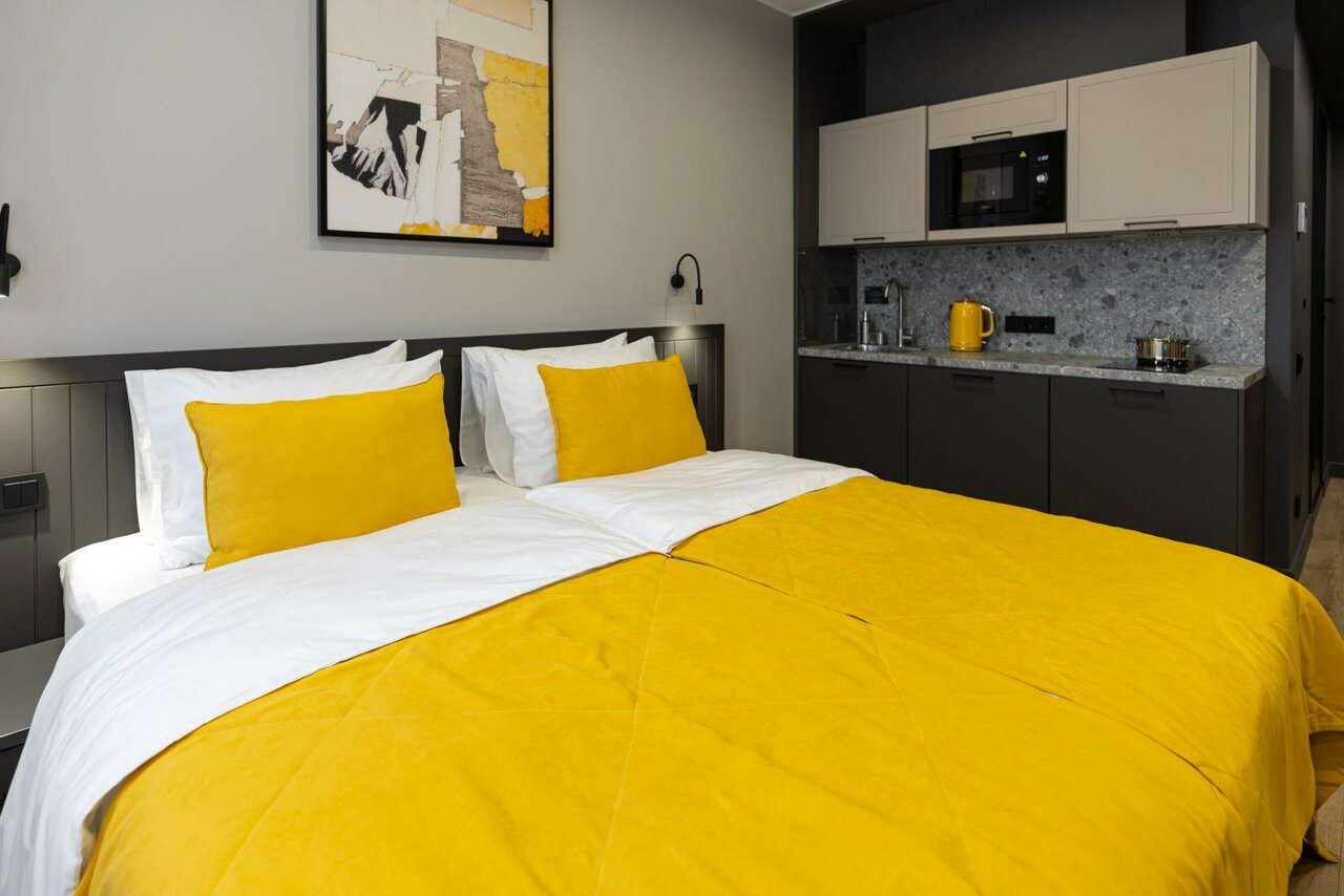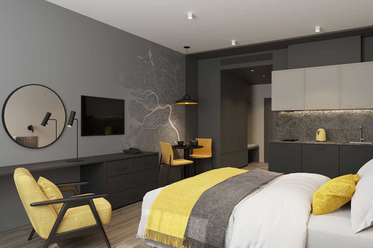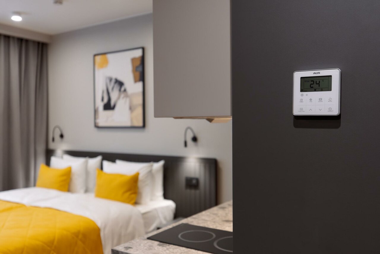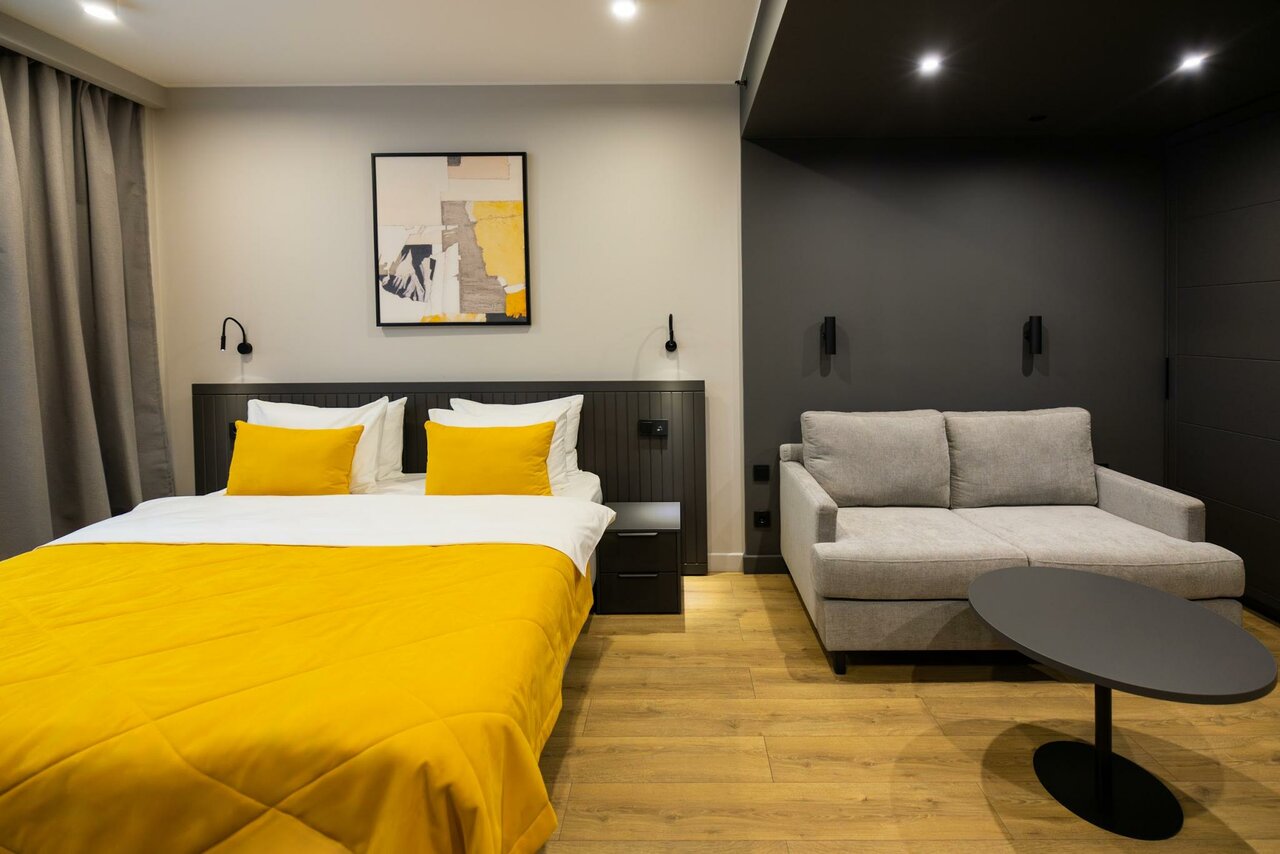 Прекрасный и современный апарт отель. Ставлю его в ряд любимых отелей. Посетил номер Deluxe за вполне скромные деньги. В номере очень просторно и уютно. Места полно для всего. Централизованная система вентиляции работает тихо, практически не слышно. Так совпало, что этот номер подходит для людей с повышенными потребностями: широкие дверные проемы, поручни там где это необходимо. Сантехника качественная и удобная. Кровать довольно широкая, мягкая и удобная. Куда бы не упал взгляд, чего бы не коснулся везде все на отлично. Особенно радуют простые и нужные мелочи, как прикроватные type-c розетки для зарядки телефона.