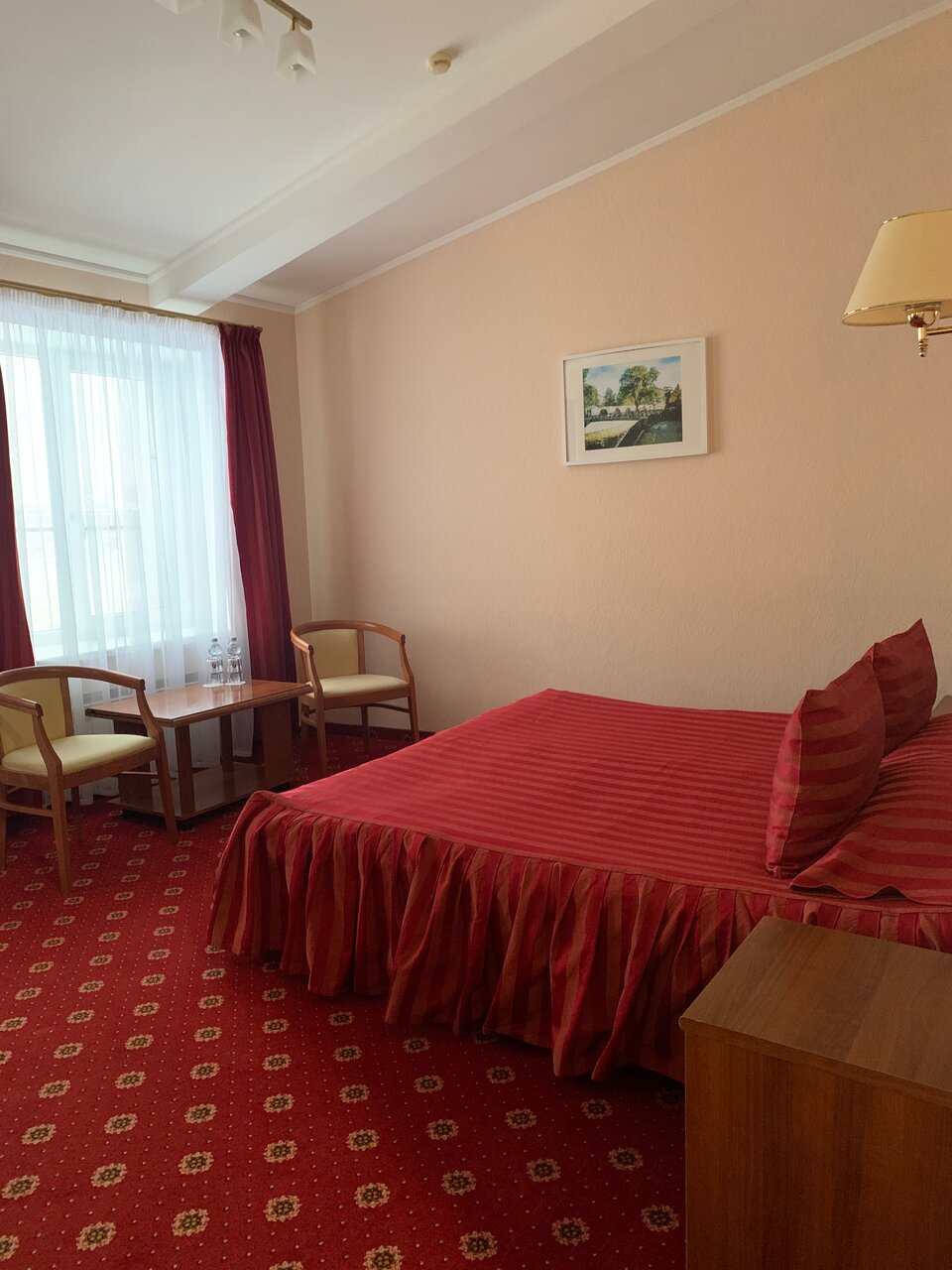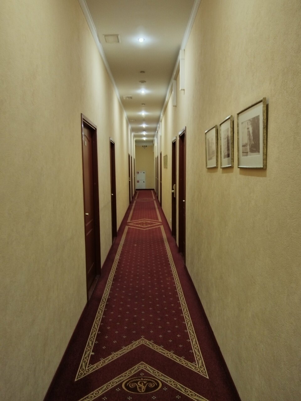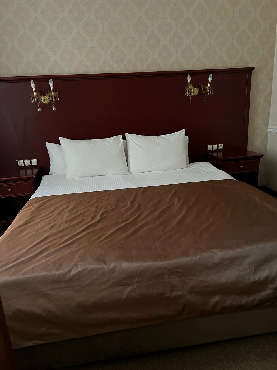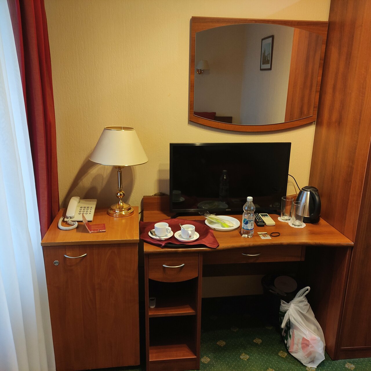 Плюсы: отлично работающий кондиционер, хотя видно что старенький; сантехника нигде не течет и справляется со своими обязанностями. Минусы: всё очень старое, тут уже хоть наводи чистоту, хоть нет — поможет только глобальный ремонт. НЕТ чайника, халата, тапочек, зубного набора. Всюду несвежий, затхлый запах — на входе, в номере, в ресторане. Шум похожий на генератор за окном мешал спать. Неудобная подушка. Продавленные матрасы. Нет освещения и розетки около изголовья кровати. Розетка одна в номере, в ней тройник и в него подключены холодильник и тв.