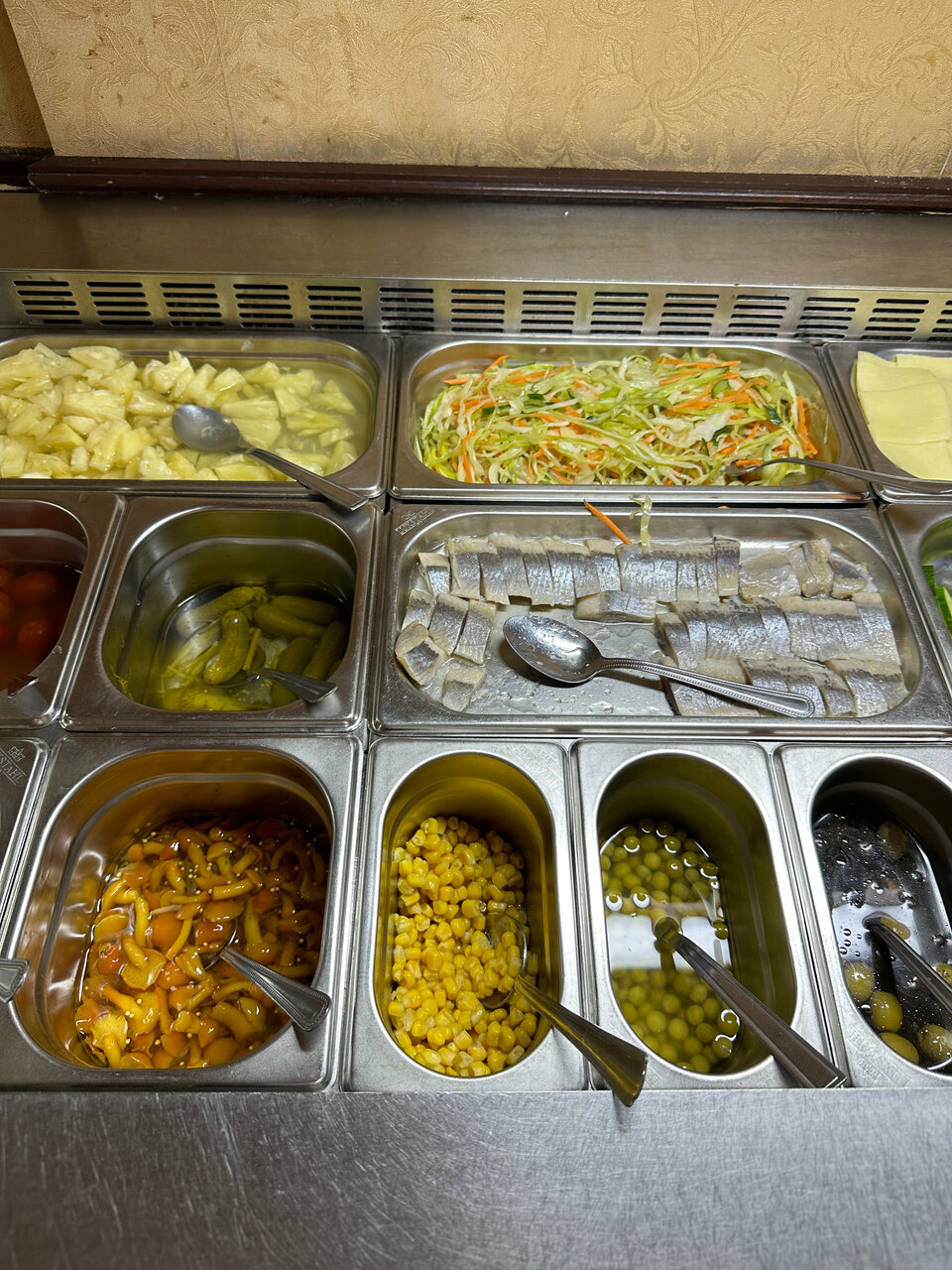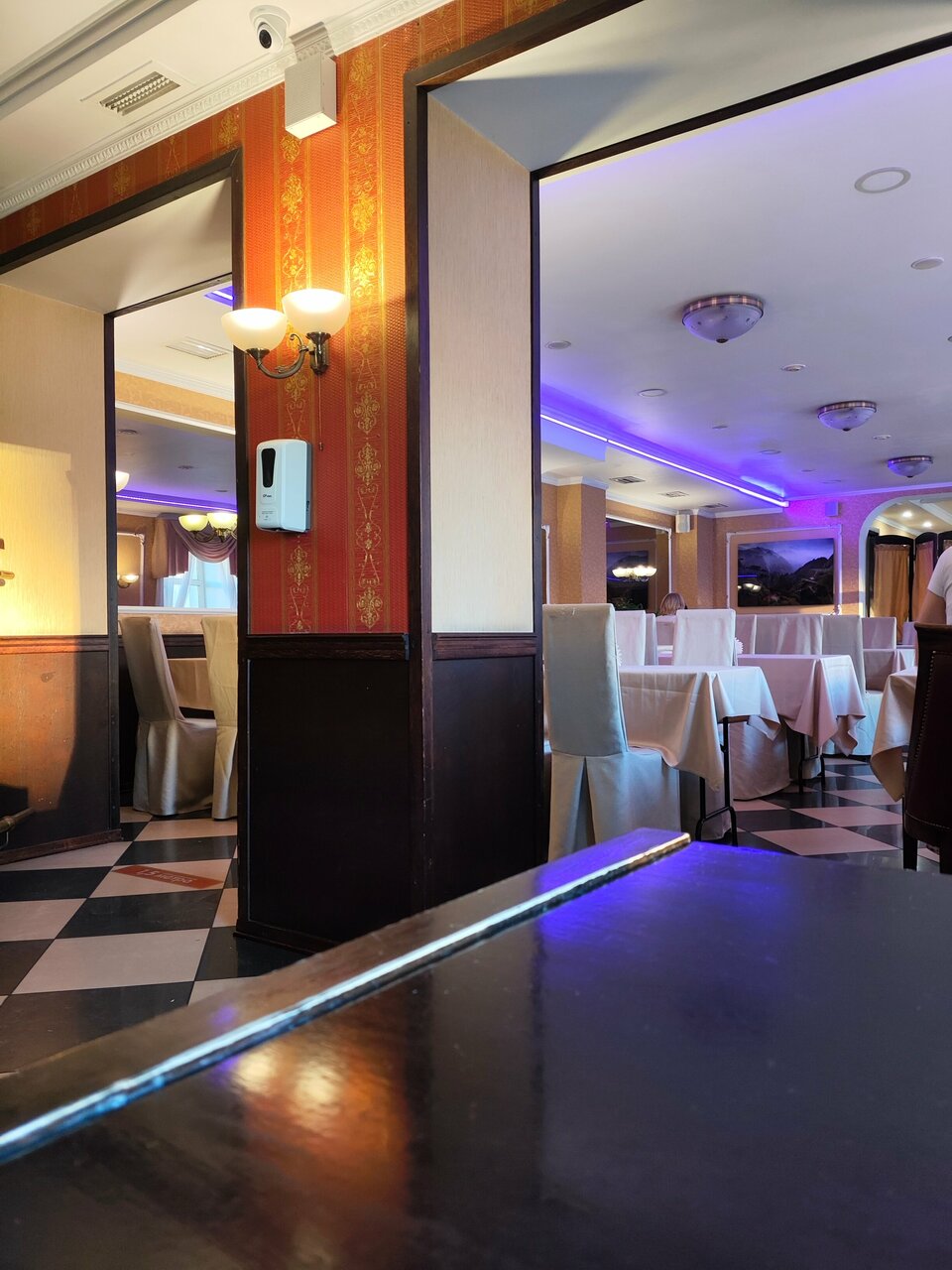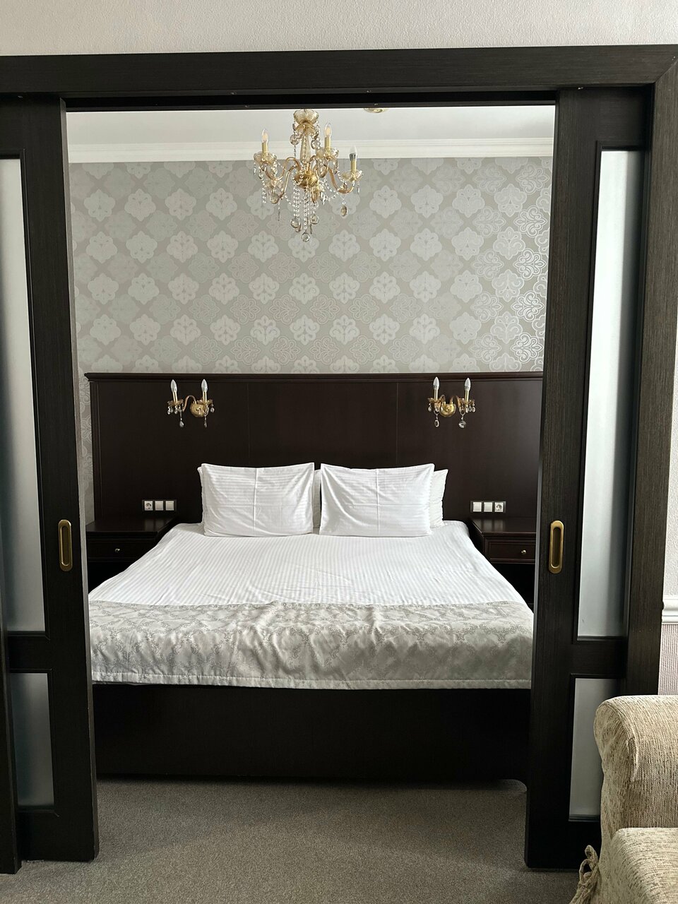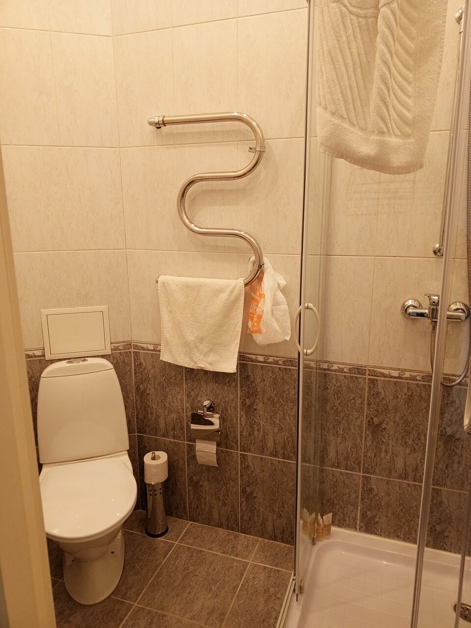 Плюсы: отлично работающий кондиционер, хотя видно что старенький; сантехника нигде не течет и справляется со своими обязанностями. Минусы: всё очень старое, тут уже хоть наводи чистоту, хоть нет — поможет только глобальный ремонт. НЕТ чайника, халата, тапочек, зубного набора. Всюду несвежий, затхлый запах — на входе, в номере, в ресторане. Шум похожий на генератор за окном мешал спать. Неудобная подушка. Продавленные матрасы. Нет освещения и розетки около изголовья кровати. Розетка одна в номере, в ней тройник и в него подключены холодильник и тв.