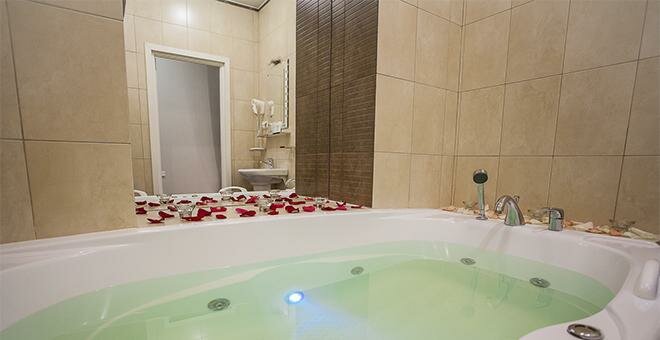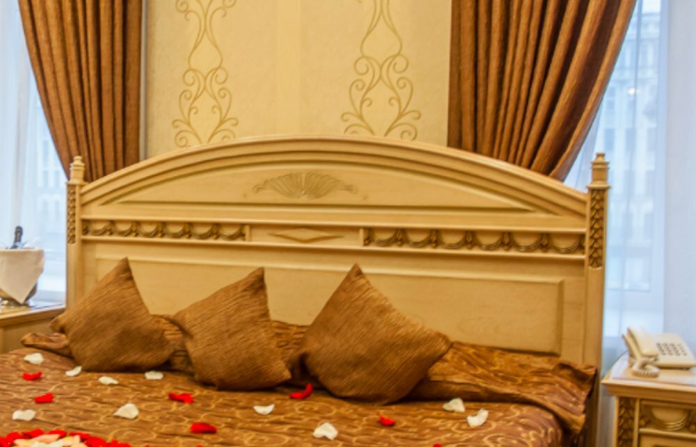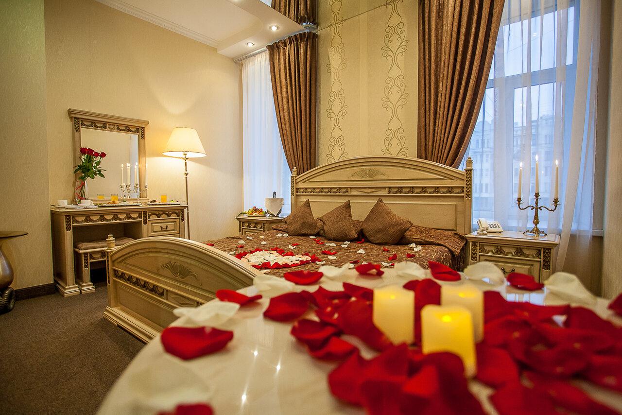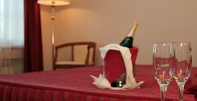 Проведите время вдвоём в номере, украшенном лепестками роз! После свадебных хлопот, в конце дня мы предлагаем Вам уединиться вдвоем, расслабиться в джакузи, насладиться игристым вином, фруктами и видом на Петербург.